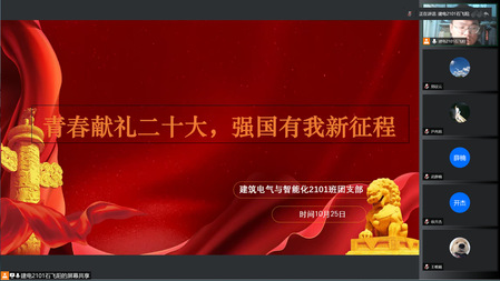 活动中,各班级团支部书记通过PPT向团员青年详细讲解了党的二十大精神的重要意义和丰富内涵,号召全体同学弘扬伟大建党精神,自信自强、守正创新,踔厉奋发、勇毅前行。随后,各班级开展了党的二十大知识问答、党的二十大精神研讨交流活动,进一步加深了大家对党的二十大会议精神的理解。在交流活动中,建筑电气与智能化21-02班于治招谈到:“作为当代新青年,我们生在红旗下,长在春风里。作为一名团支书,对待工作要有热情、科学精神与务实的作风;要谦虚谨慎,扬长避短,严于律己,虚心请教他人的学习经验;在日常工作中,不断总结经验教训,勇于创新,以实际行动向党组织靠拢。”建筑环境与能源应用工程21-01班侯喜伶谈到:“辉煌成就离不开理论支撑,作为青年马克思主义者,我们必须要深入学习马克思主义理论,弘扬伟大建党精神,积极参与到中国特色社会主义事业之中,胸怀伟大祖国,深入神州大地,用青春告白祖国。”