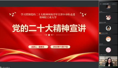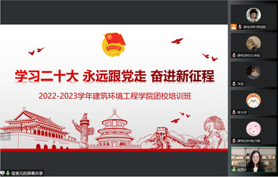 11月17日晚,建筑环境工程学院在线上举行团校培训班开班仪式。团委书记寇誉元介绍了团校培训的整体安排及重要意义,表达了对与会团学骨干的期待与鼓励,勉励全体学员一要提升思想认识,提高政治站位,充分认识团校培训的重要性;二要珍惜培训机会,加强理论学习,提升自身政治素质;三要创新工作方法,提升工作效率,增强服务同学的水平及能力。她希望全体学员能够积极学习,勇于实践,在团校培训中收获进步与成长,努力成为勤于学习、善于创造、甘于奉献的青年学生政治骨干。随后,寇誉元以党的二十大精神宣讲开启团校培训第一讲。