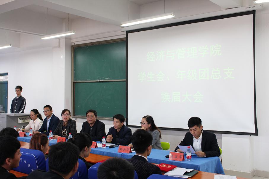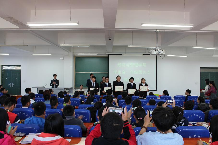 10月27日中午,经济与管理学院学生会、年级团总支换届大会在科学校区经管楼211隆重举行。经济与管理学院党总支书记邢晟、分团委、学工办全体老师出席了本次大会,上一届学生会主要学生干部、新一届学生会和2014、2015级年级团总支全体成员参加了会议。会议由分团委书记陈章美主持。