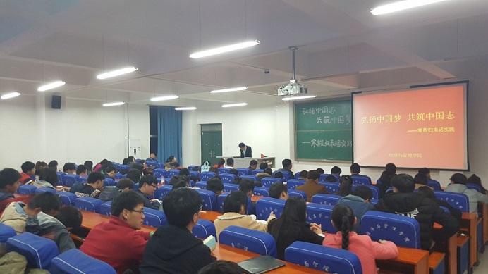 为了巩固寒假社会实践活动的成果,进一步交流经验、心得和体会,不断提高大学生的实践能力和创新意识,3月13日晚上19:00,我院在经管楼211举办了“弘扬中国志,共筑中国梦”寒假归来话实践报告会,经济与管理学院学生干部和2015级全体学生参加了报告会。