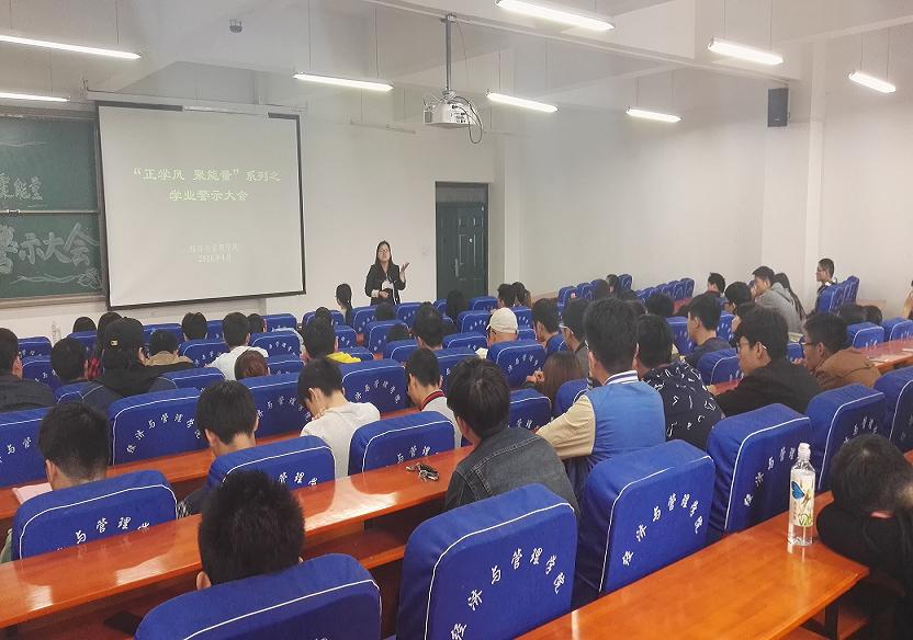 为进一步加强学风建设,提高学生学习质量,督促学生顺利完成学业,4月20日中午,经济与管理学院在经管楼211举办了“正学风聚能量”系列活动--学业警示教育大会。经济与管理学院党总支副书记陈章美、学工办副主任王静、教学秘书何洋、各班学习委员以及受到学业警示的学生参加了会议。会议由学工办副主任王静主持。