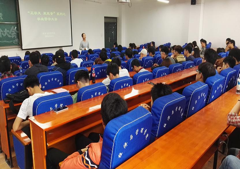 何洋老师就学生的学分、学籍等方面进行了重点阐述,她强调每一位学生都应该树立自信,加强过程管理,不要放松自己,以优异成绩完成学业。王静老师介绍了本次学业警示教育大会的目的和意义,并就我院接下来开展的“学风建设随手拍”、“学风督察月表彰大会”、“2013级考研动员会”、“考研经验交流会”等学风建设活动进行了安排。最后,王老师强调,每一位学生都应学会自我反思,善于总结,在学习的过程中更加注重自我管理。