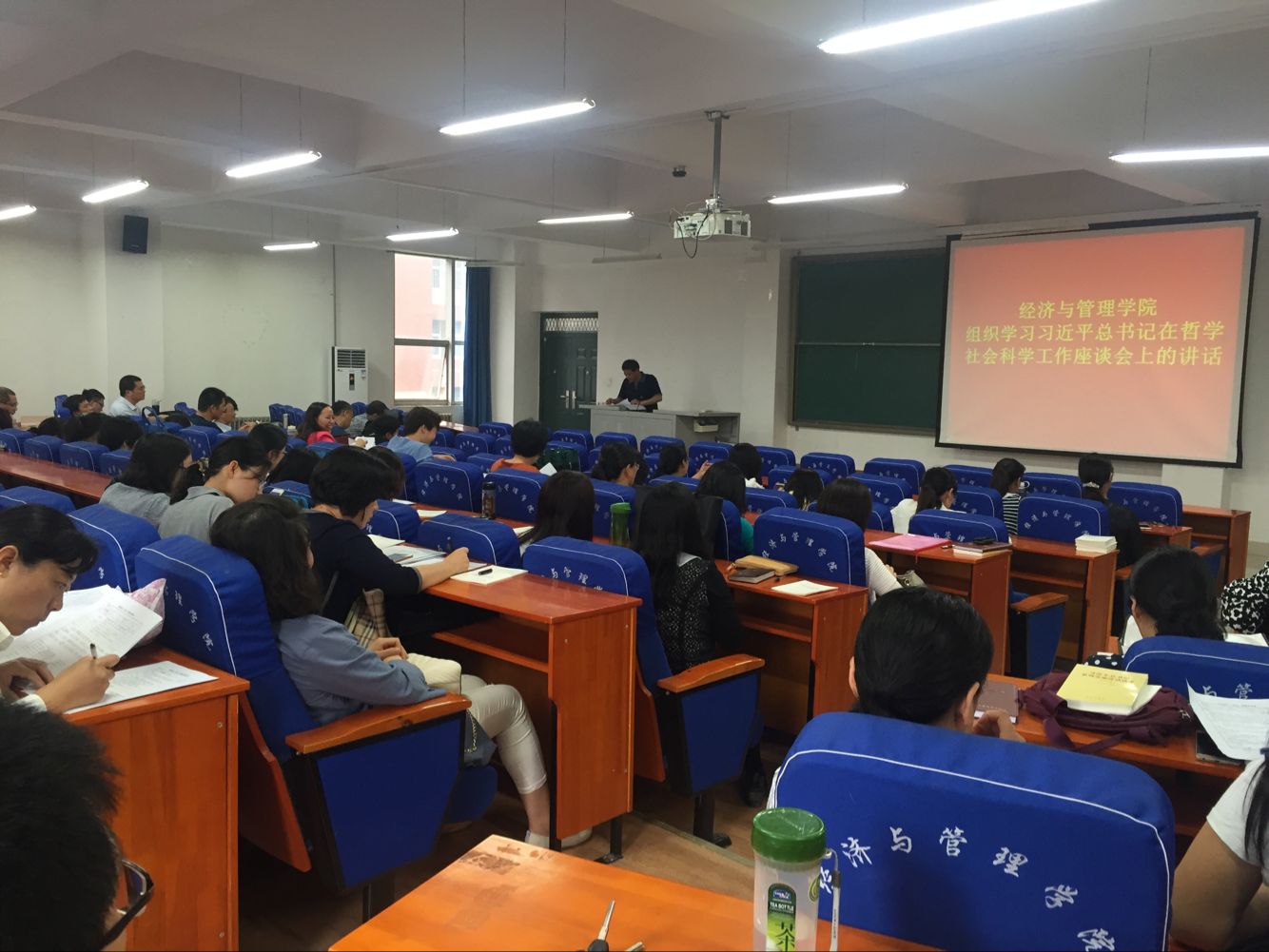 6月2日下午14:10,经济与管理学院在经管楼211召开全体教职工大会。党总支书记邢晟主持学习习近平总书记在哲学社会科学工作座谈会上的讲话。