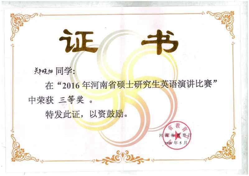 5月7日至8日,由河南省教育厅主办的2016年河南省硕士研究生英语演讲比赛在郑州大学隆重举行。来自郑州大学、河南大学、河南师范大学、解放军信息工程大学等省内21所研究生培养单位的76名非英语专业硕士研究生参加了比赛。经济与管理学院2015级MPAcc专业研究生郑晓旭同学代表学校参赛,最终荣获三等奖。