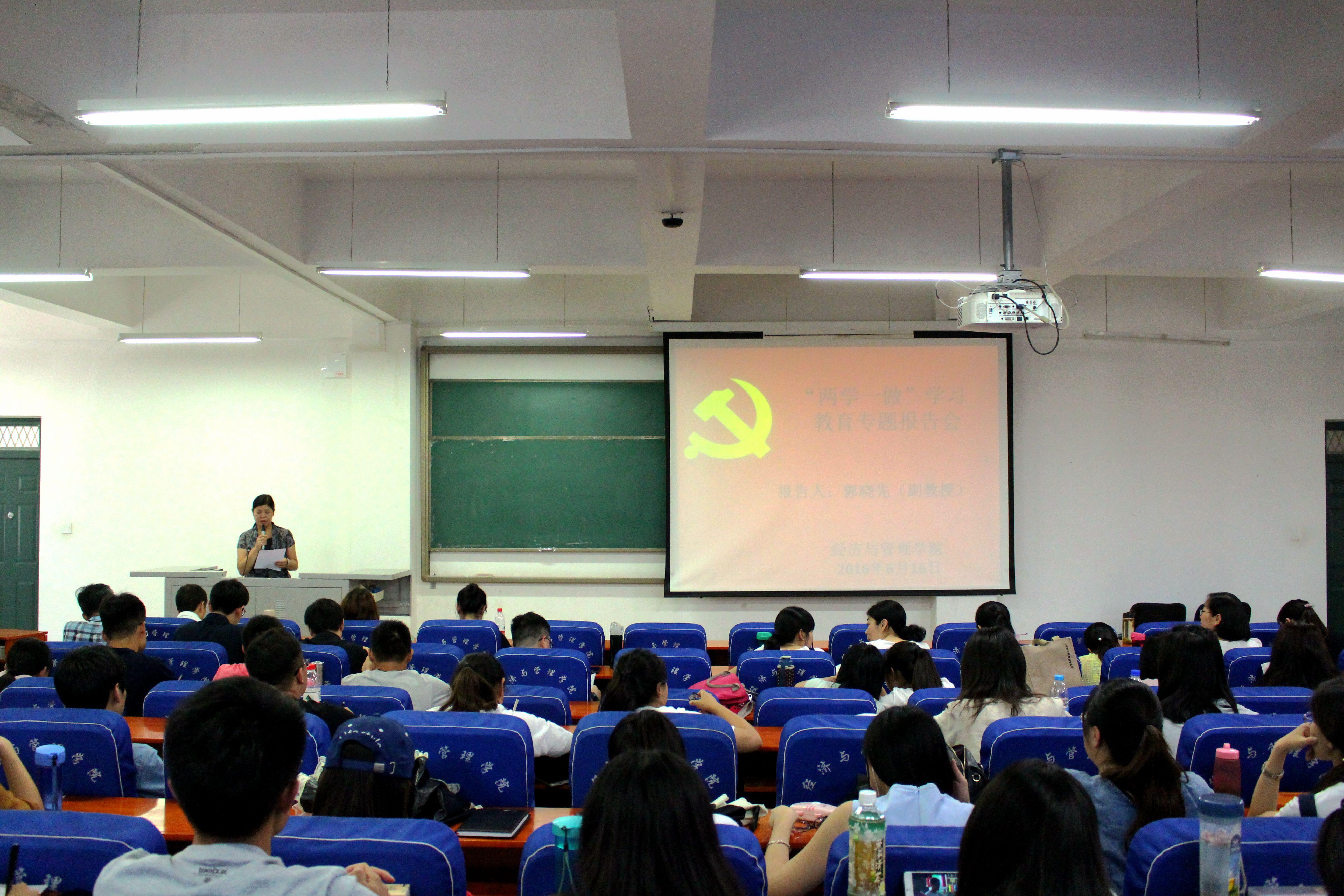 为全面贯彻落实中共中央《关于在全体党员中开展“学党章党规、学系列讲话,做合格党员”学习教育方案》的精神要求,2016年6月16日下午15:00,经济与管理学院特邀请思政部郭晓先副教授在经管楼211作了以“深入开展‘两学一做’,塑造优秀共产党员”为主题的报告。经济与管理学院班子成员、全体师生党员参加了报告会。报告会由刘珂院长主持。