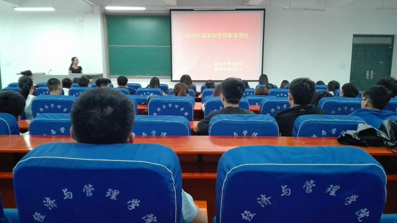 为贯彻落实学生处下发的《关于组织申请2016年国家助学贷款的通知》,627日中午12:20,经济与管理学院在经管楼211召开国家助学贷款申请流程说明及诚信教育大会,负责贷款工作的王静老师和2016年申请校园地助学贷款的学生参加了本次会议。