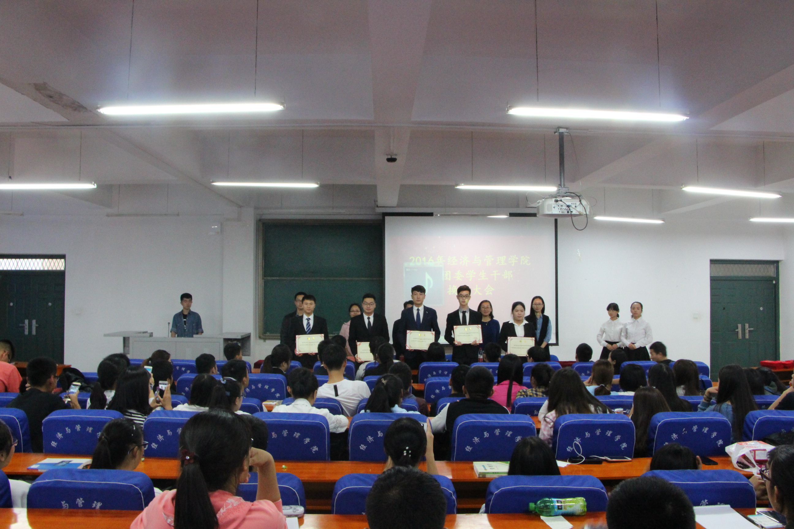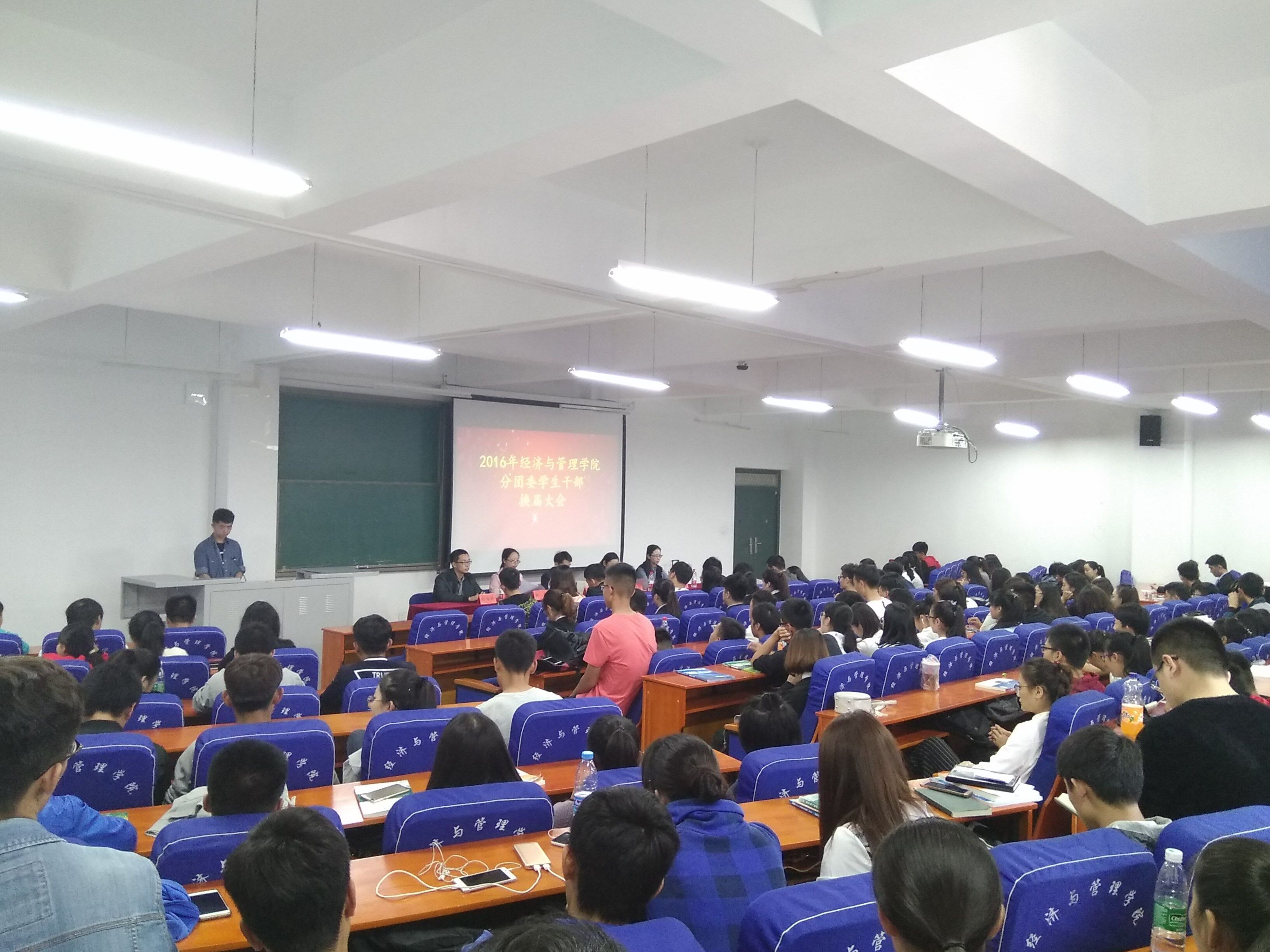 10月19日中午13:00,郑州轻工业学院经济与管理学院学生干部换届大会在经管楼211隆重召开。党总支副书记陈章美老师、分团委书记姚少华老师、学工办副主任王静老师、经管学院分团委刘海廷老师和陈思萌老师及全体团总支和学生会成员出席了本次会议。会议由分团委书记姚少华老师主持。
