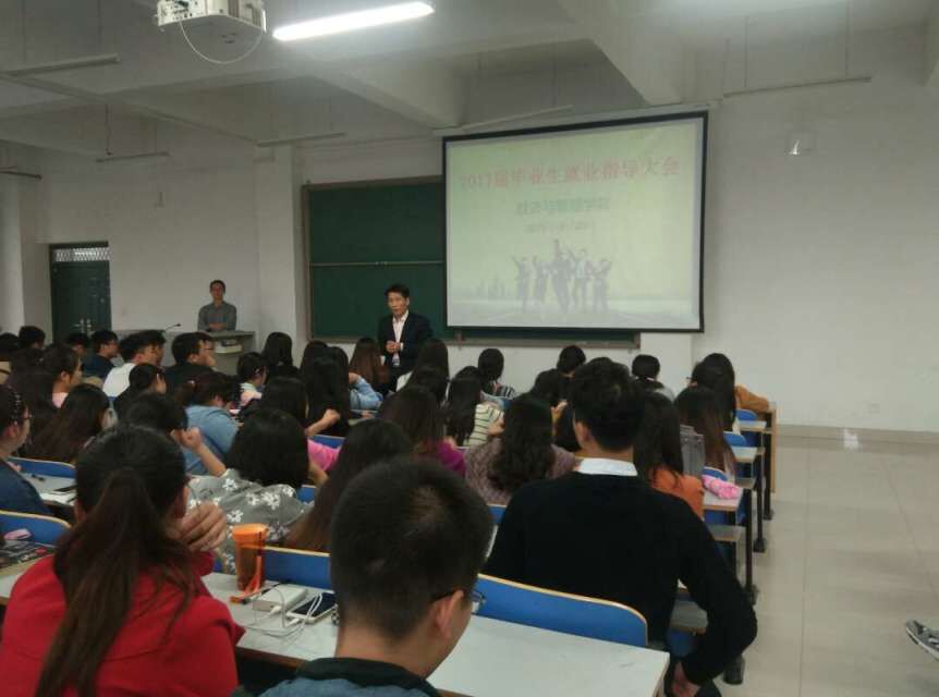为使毕业生树立正确的就业观念,帮助学生做好求职前的准备工作,10月20日下午,经济与管理学院2017届毕业生就业指导大会在经管楼309教室举行。经济与管理学院党总支副书记陈章美、就业指导老师刘海廷和全体2017届毕业生参加了会议。