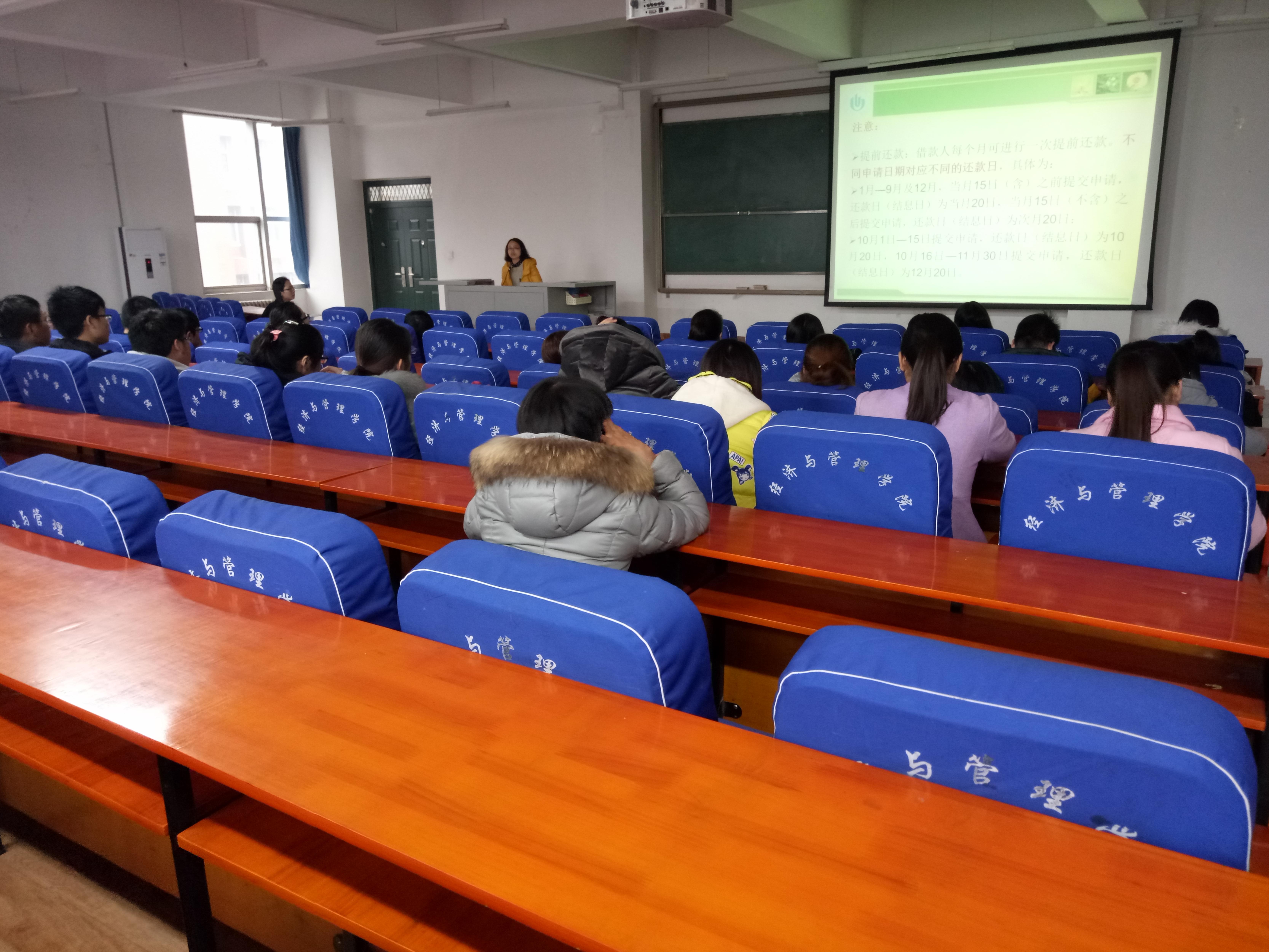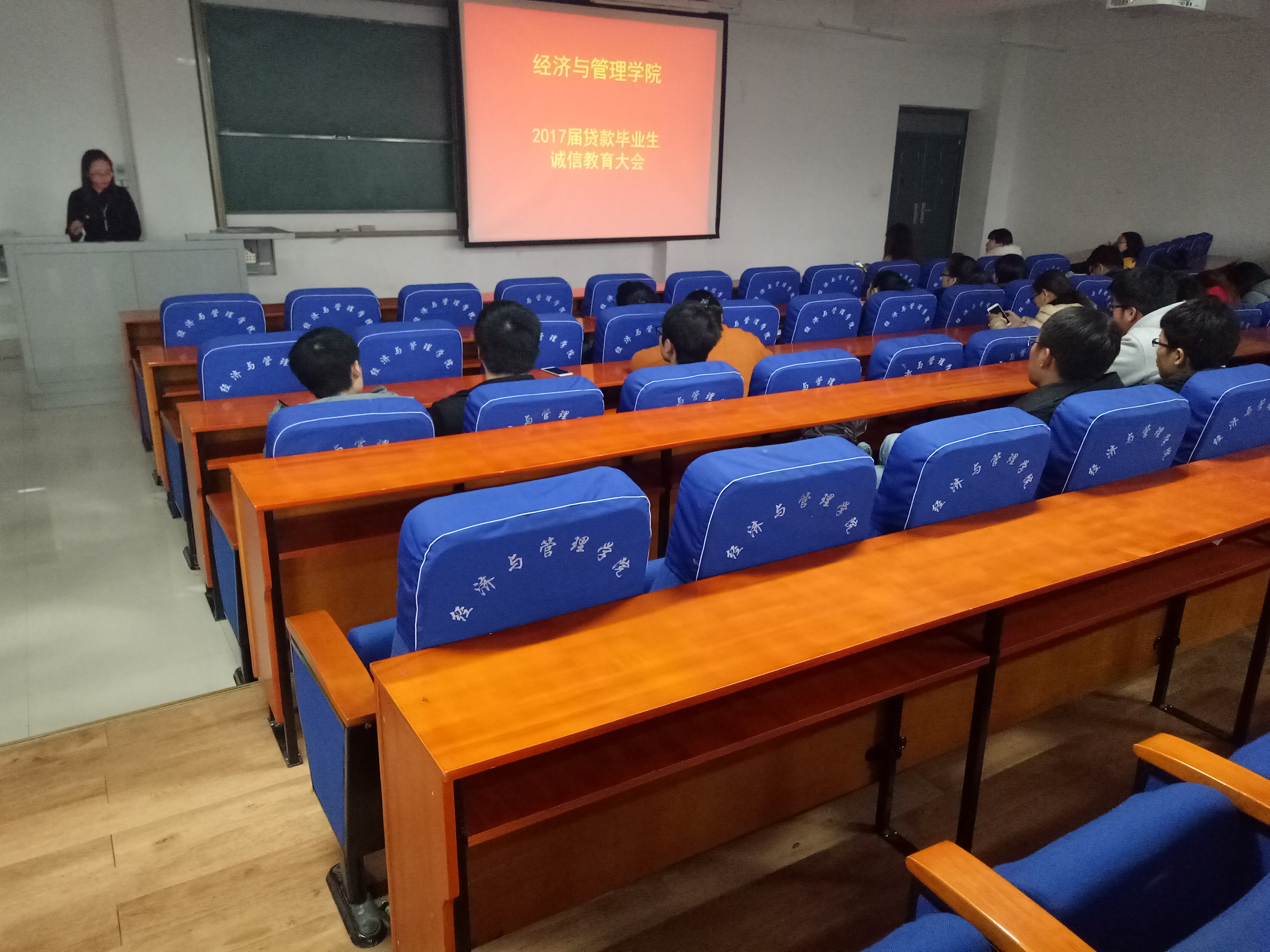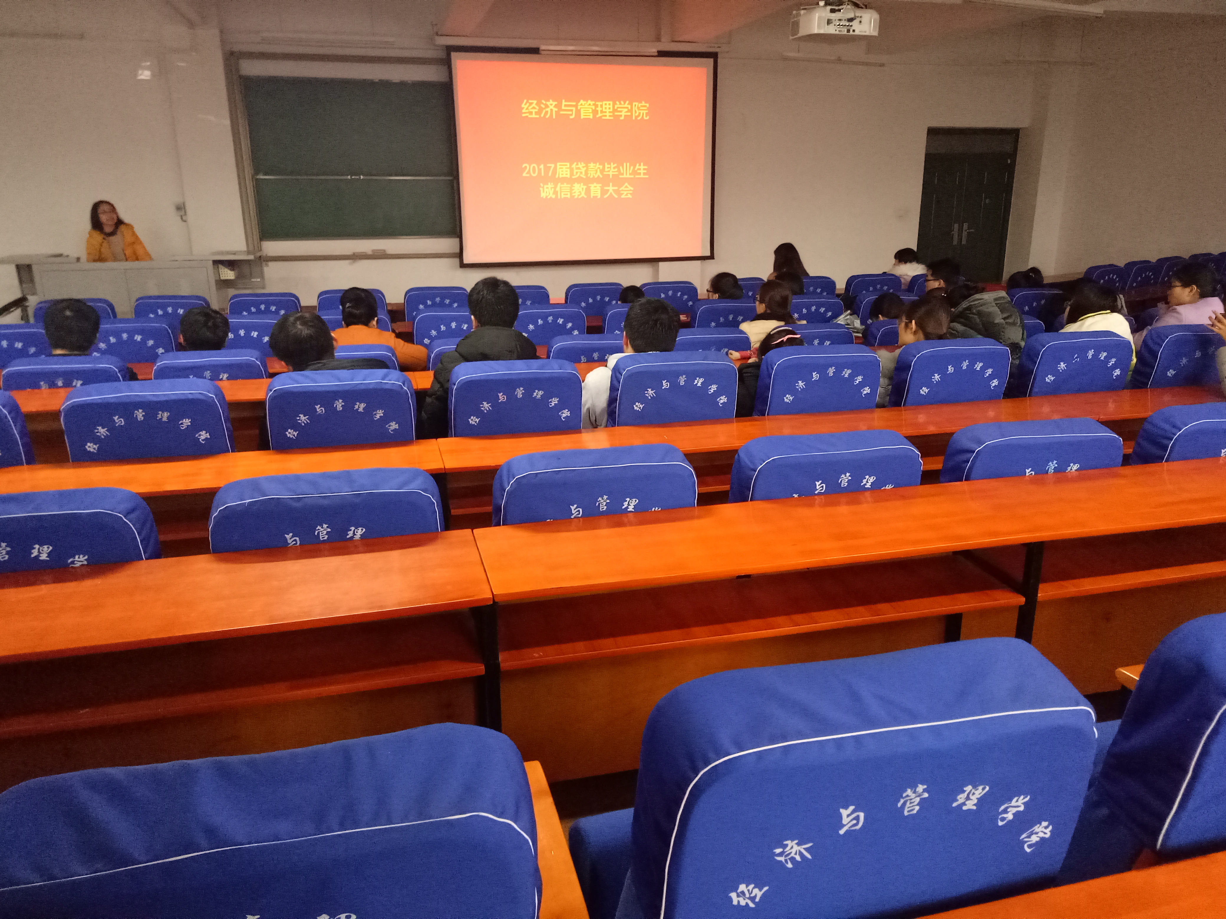 为强化学生诚信意识,进一步做好我院2017届毕业生贷款工作,12月26日下午1点,经济与管理学院在科学校区经管楼211室召开“2017届贷款毕业生诚信教育大会”,学工办副主任王静老师、负责贷款的陈思萌老师以及2017届贷款毕业生参加了此次大会。