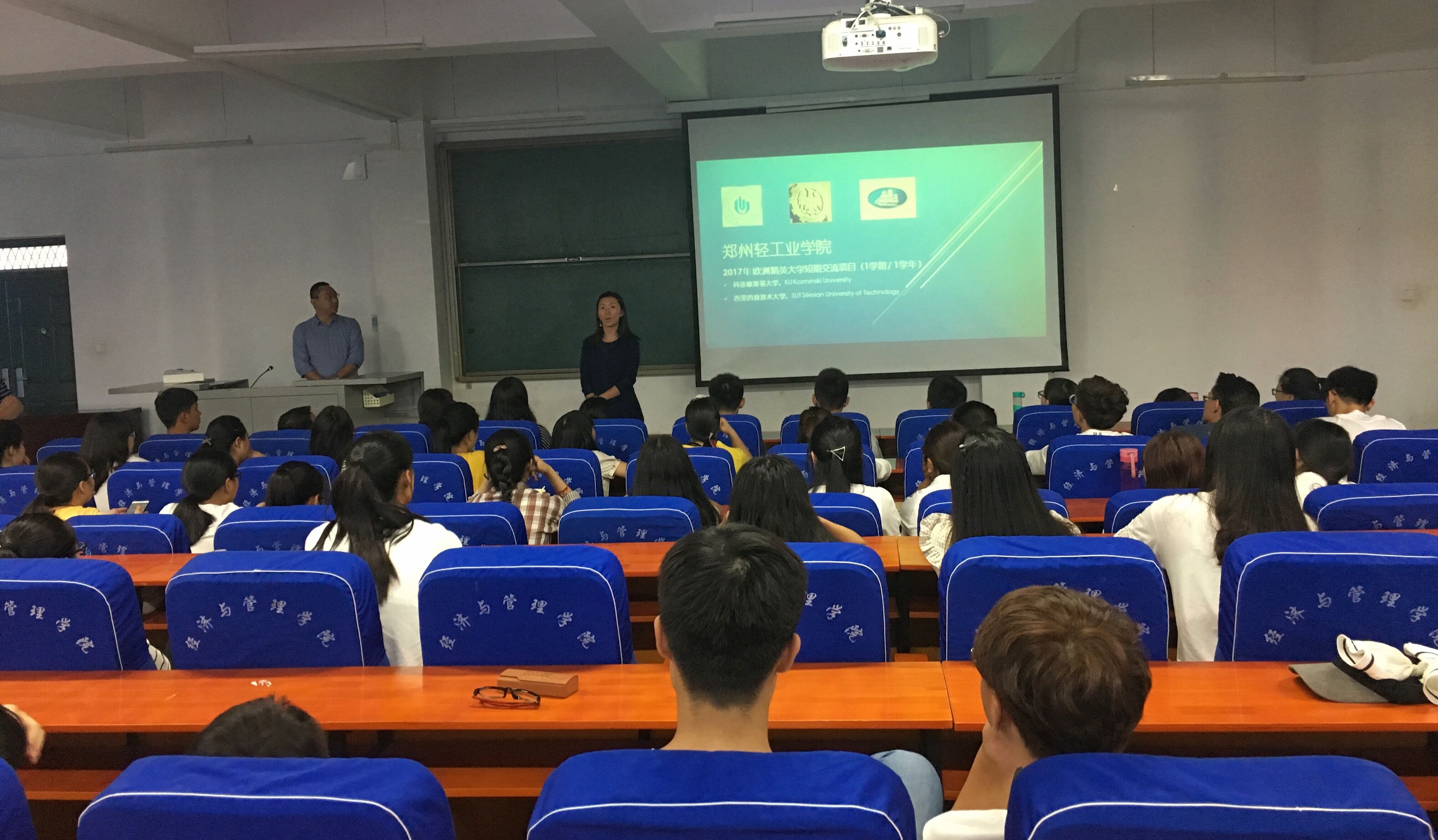 Kozminski University是欧洲顶尖的商学院,是全国仅有的几所同时被EQUIS.AACSB和AMBA认证的商学院之一,且被盛名的英国《金融时报》排行榜列为最好的全球商学院之一。宣讲会上,李老师就波兰的历史文化、地理环境及学生学习生活情况等方面向同学们作了详细介绍。接着,李老师从大学的教学体系、教学成果、课程设置、合作模式和授课费用五个方面进行阐述说明。他指出,科依敏斯基大学教学方面存在明显的优势,且在课程设置上没有国别差异,中外学生享有共同的学习资源。随后,李老师就留学手续等相关问题一一为同学们作了说明,并为同学们展示了科依敏斯基大学的优美景色,鼓励同学们认真学习,抓住国际化的交流机遇。最后,国际交流与合作处韩芳老师对项目申报要求进行了相应的补充,并强调学好英语的重要性。