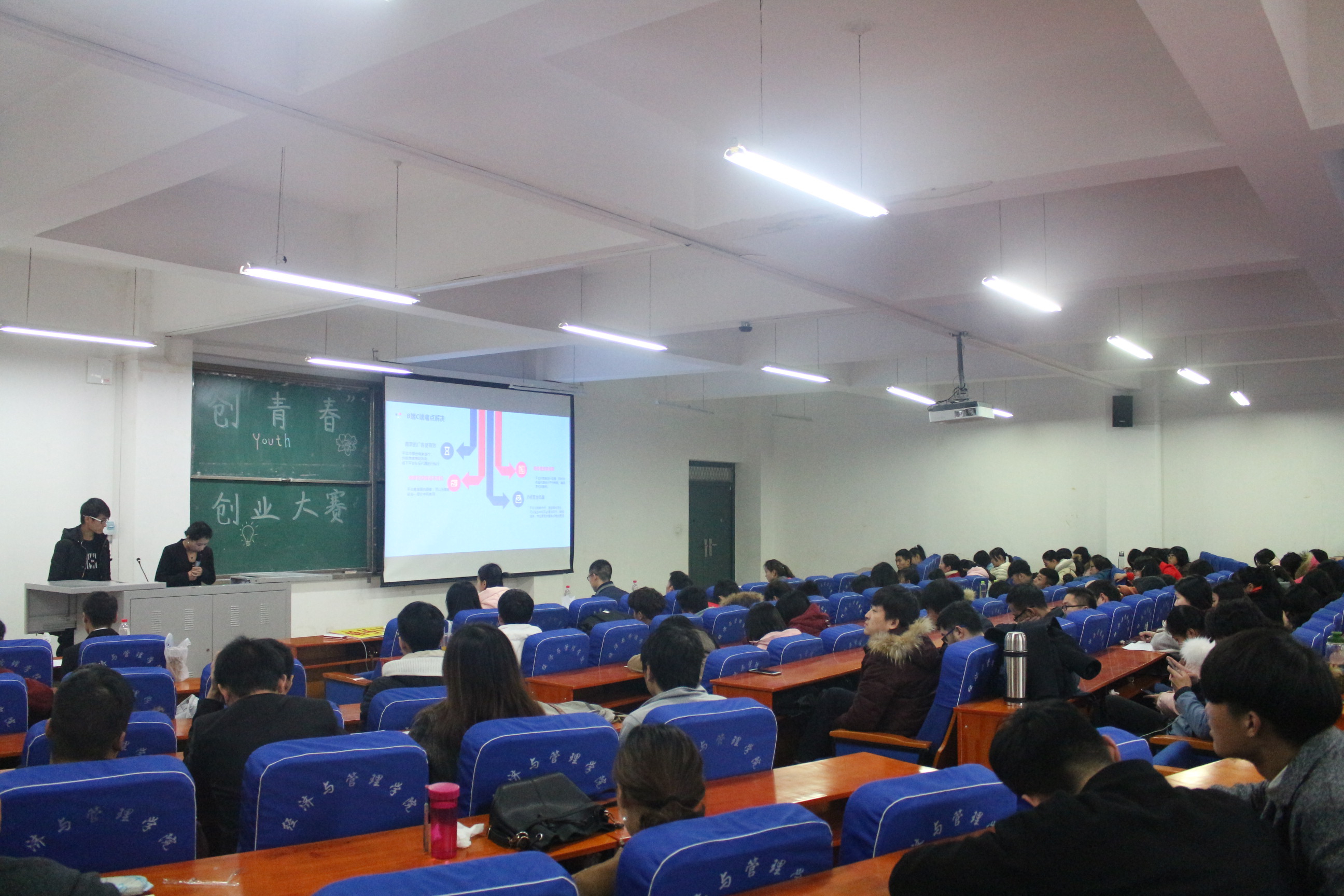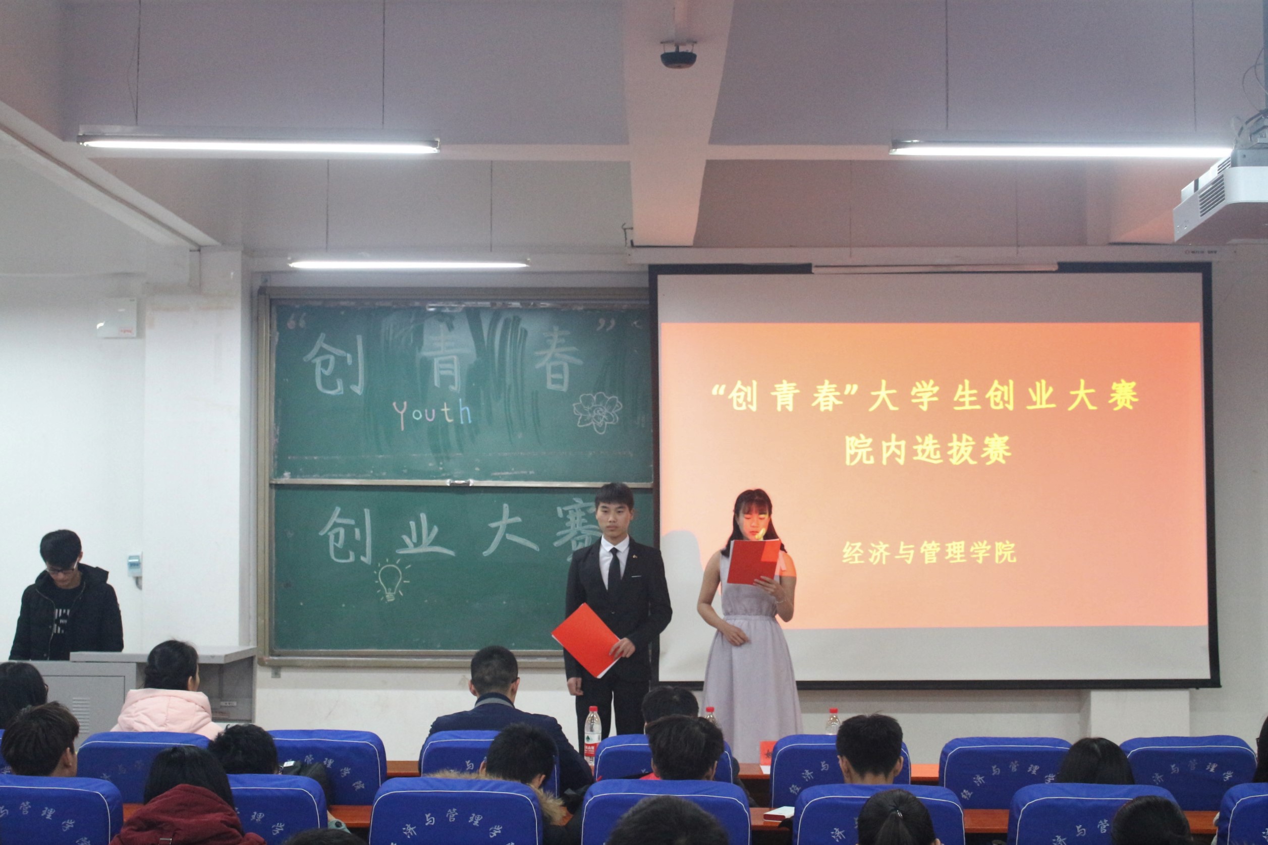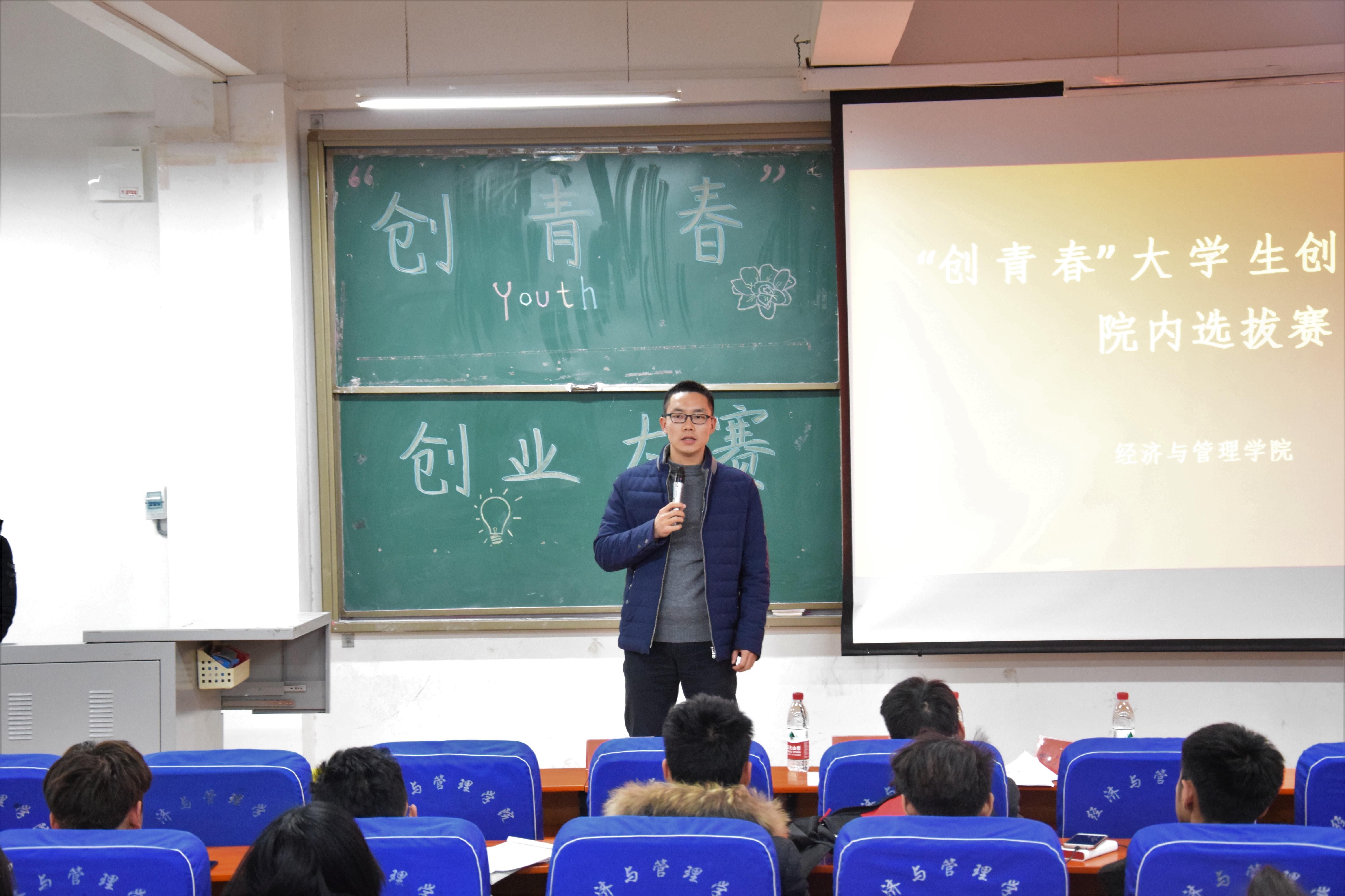 为深入学习贯彻党的十九大精神,学习习近平新时代中国特色社会主义思想,引导在校大学生树立创新意识、培养创新思维、弘扬创业精神,提高大学生就业竞争能力和创业能力,12月13日下午14:30,在经管楼211,经济与管理学院举办弘扬“十九大”•“创青春”创业大赛院内选拔赛。