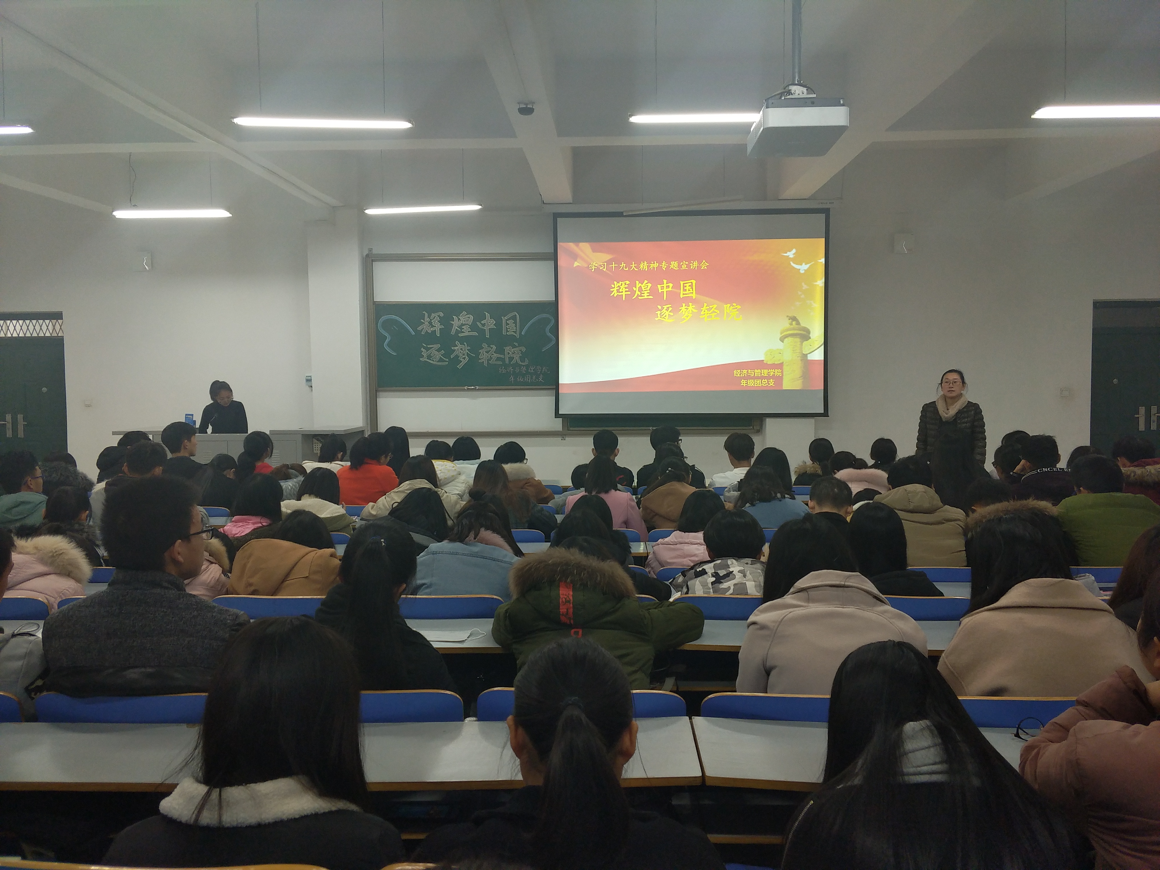 为深入学习贯彻党的十九大精神,了解党的十八大以来党和国家事业发生的历史性变革,提高广大学生的政治思想觉悟。经济与管理学院分团委年级团总支于2017年12月18日下午15:00,在经管楼309举办主题为“辉煌中国,逐梦轻院”的学习十九大精神专题宣讲会。院长刘珂、分团委书记姚少华老师和我院部分班级的全体同学参加此次活动。