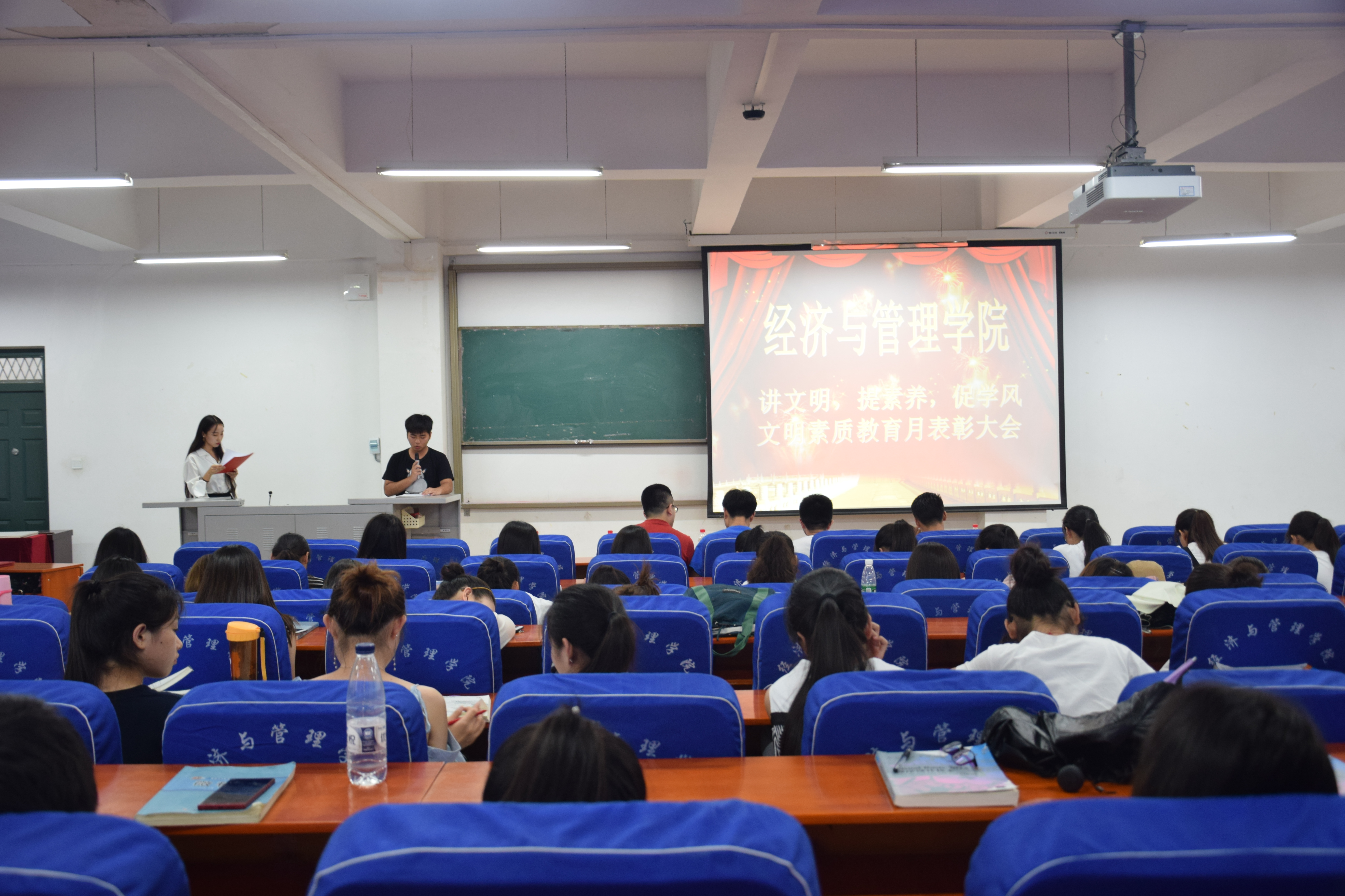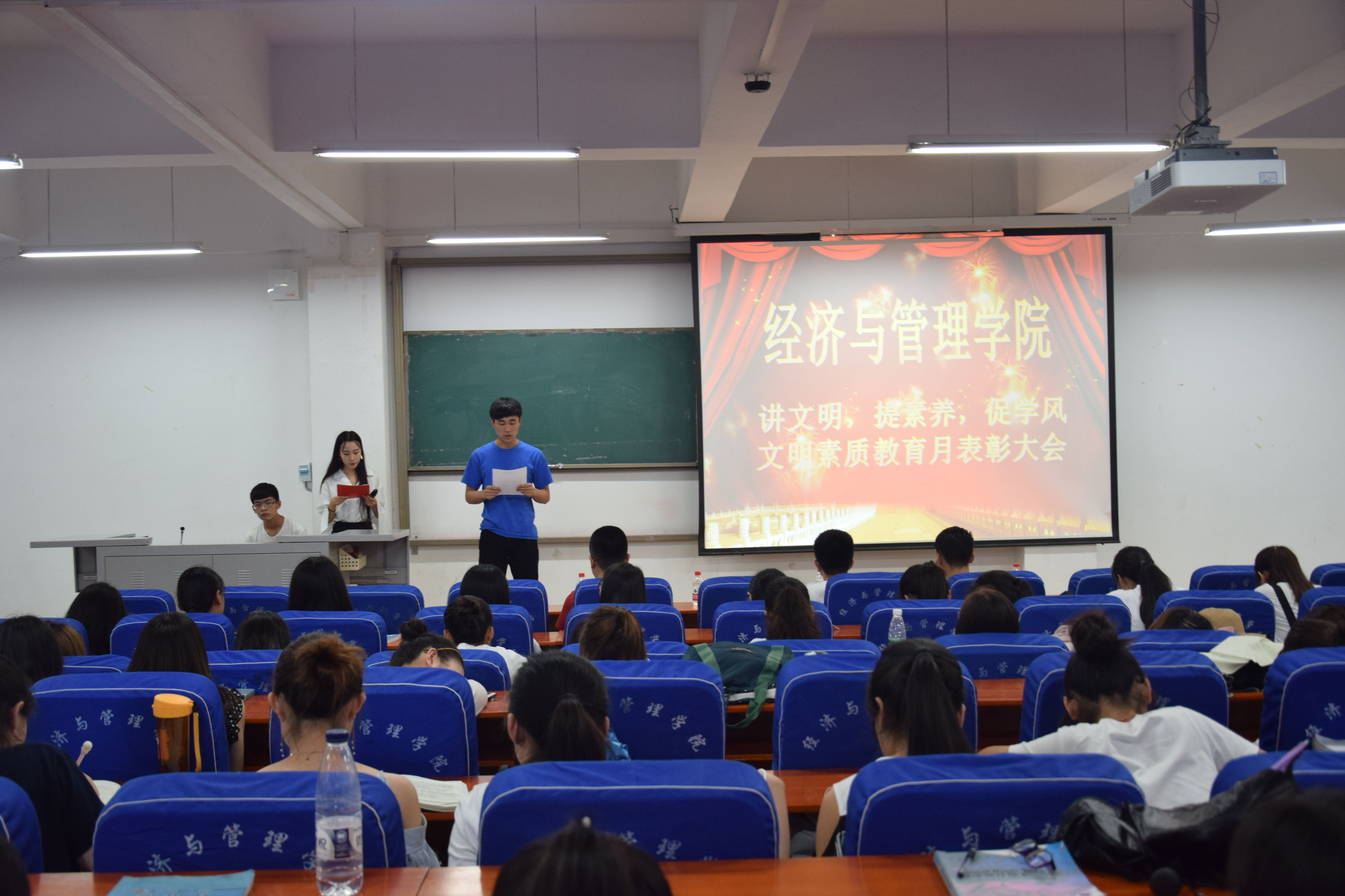 为响应学校号召,加强学院学风和文明素质教育建设,提高学生学习的积极性和主动性,营造良好的学习环境和学习氛围,经济与管理学院于6月28日中午,在经管楼211举办了“讲文明,提素养,促学风”文明素质月表彰大会。经济与管理学院学生干部及各班班长、团支书和班级同学代表等参加了此次大会。
