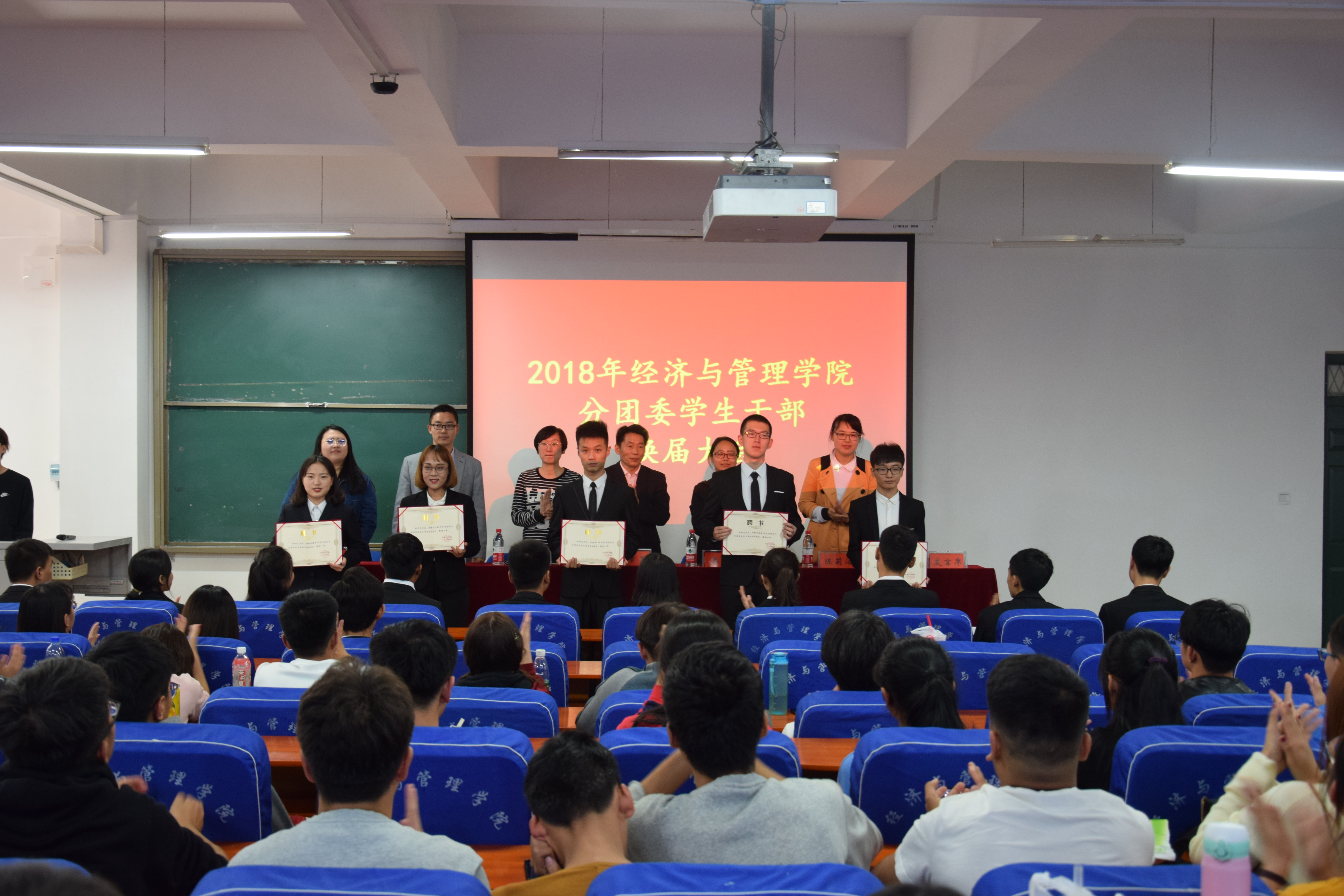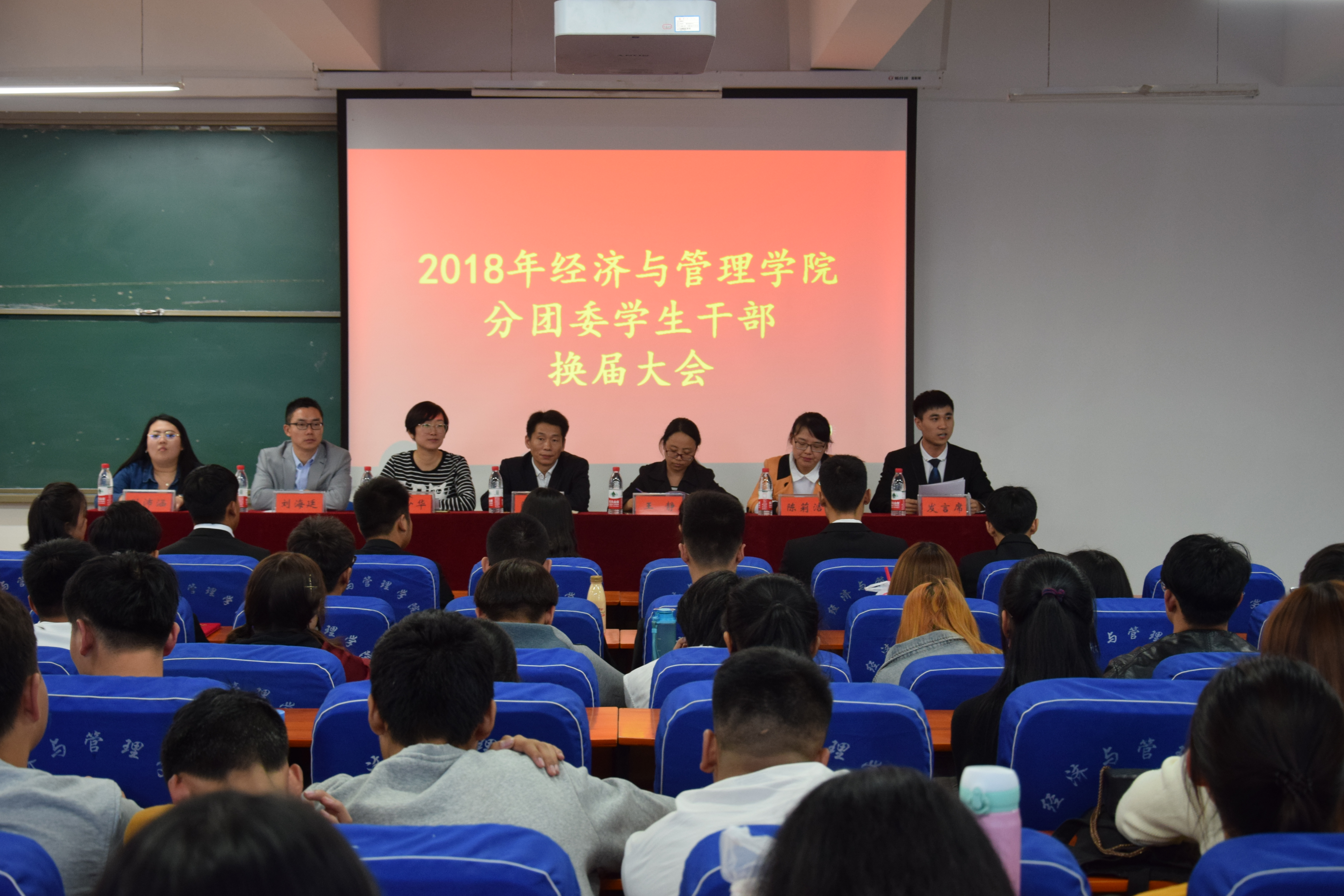 2018年10月12日中午12:30,郑州轻工业学院经济与管理学院学生干部换届大会在经管楼211隆重召开。党总支副书记陈章美老师、分团委书记姚少华老师、学工办副主任王静老师、专职辅导员刘海廷老师、陈莉洁老师、孙沛涵老师出席本次大会,上一届学生会、团总支主要学生干部以及新一届学生干部全体成员出席了本次会议。会议由分团委书记姚少华老师主持。