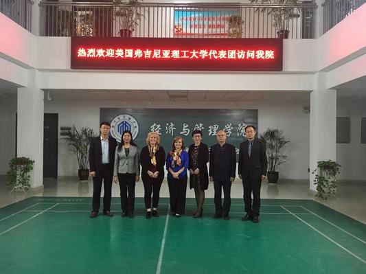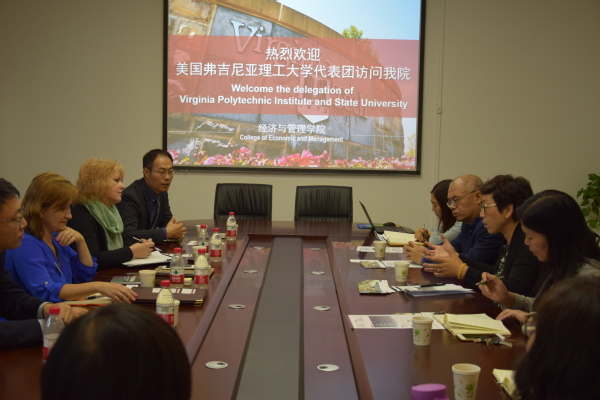 2018年10月26日下午16:30,美国弗吉尼亚理工大学代表团访问经济与管理学院,座谈会在经管楼219室举行,学校国际合作与交流处谈红玲处长、软件学院孙玉胜院长、经济与管理学院刘珂院长、以及学院党政办主任时军鸽、MBA/MPAcc中心副主任彭青秀、分团委书记姚少华和辅导员孙沛涵老师出席会议。会议由谈红玲处长主持。