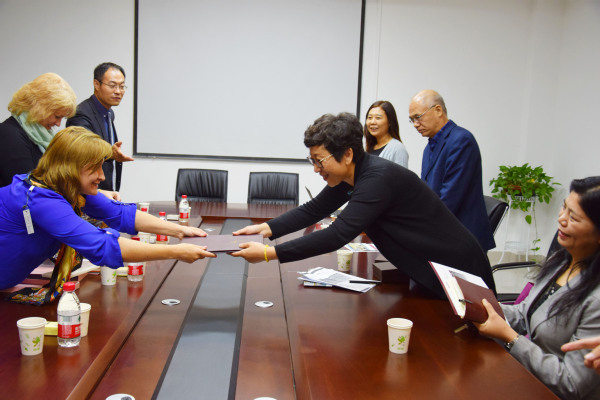 会谈结束后,美国弗吉尼亚理工大学代表团与谈红玲处长等相关负责人相互交换礼物,并合影留念。