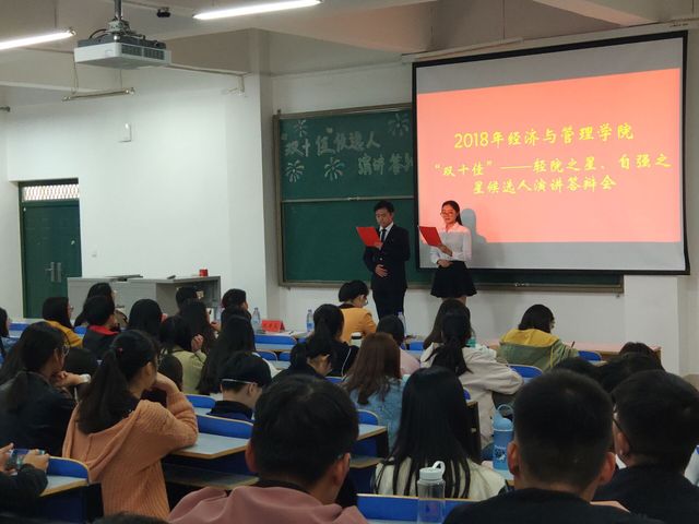 为树立大学生学习楷模,充分发挥先进典型的示范引领作用,10月31日中午12:30,经济与管理学院在经管楼309召开2018年十佳“轻院之星”、十佳“自强之星”候选人演讲答辩会。党总支副书记陈章美、学工办副主任王静、专职辅导员陈莉洁、孙沛涵及200余名学生代表参加。