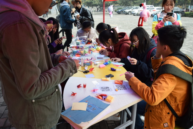 本次活动通过折七色千纸鹤和动手制作手工轻型粘土来拉近陌生人之间的交流与合作,帮助一些惧怕陌生交流的同学打开心扉,使之能更好的与他人交流。活动每两个人组队,一人折千纸鹤,折好之后将七种颜色的千纸鹤用线串连起来,另一人捏轻型粘土,两人合作完成后到达领奖台领取纪念品,并合影留念。“莫负韶华舞流年系列锦上添花” 活动在同学们的积极参与、通力合作中圆满结束。本次活动打破了传统的参与方式,采用互不相识的同学相互合作的参与方式,这种合作更好的诠释了人与人之间陌生交流的可行性。在合作的同时,每个人都能尽自己的最大努力去帮助自己的组合完成活动任务,达到了理想的效果。