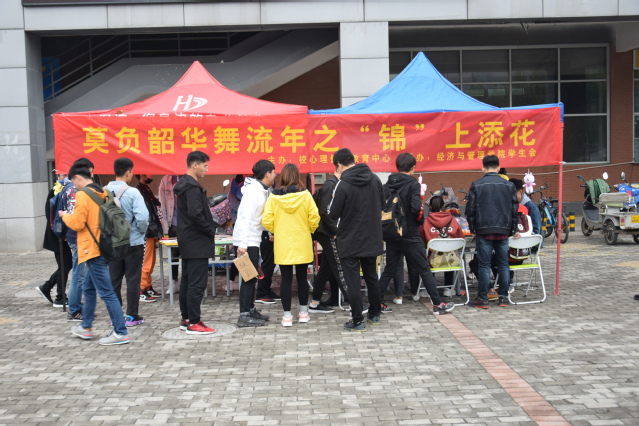 为进一步提高大学生心理健康知识水平,促进大学生身心健康协调发展,让陌生的同学彼此能够产生内心深处的共振,以更加积极的心态去面对大学生活,经济与管理学院于11月14日中午12:00在科学校区清苑餐厅门口举办蒲公英素质提升系列项目之“莫负韶华舞流年系列锦上添花”活动。