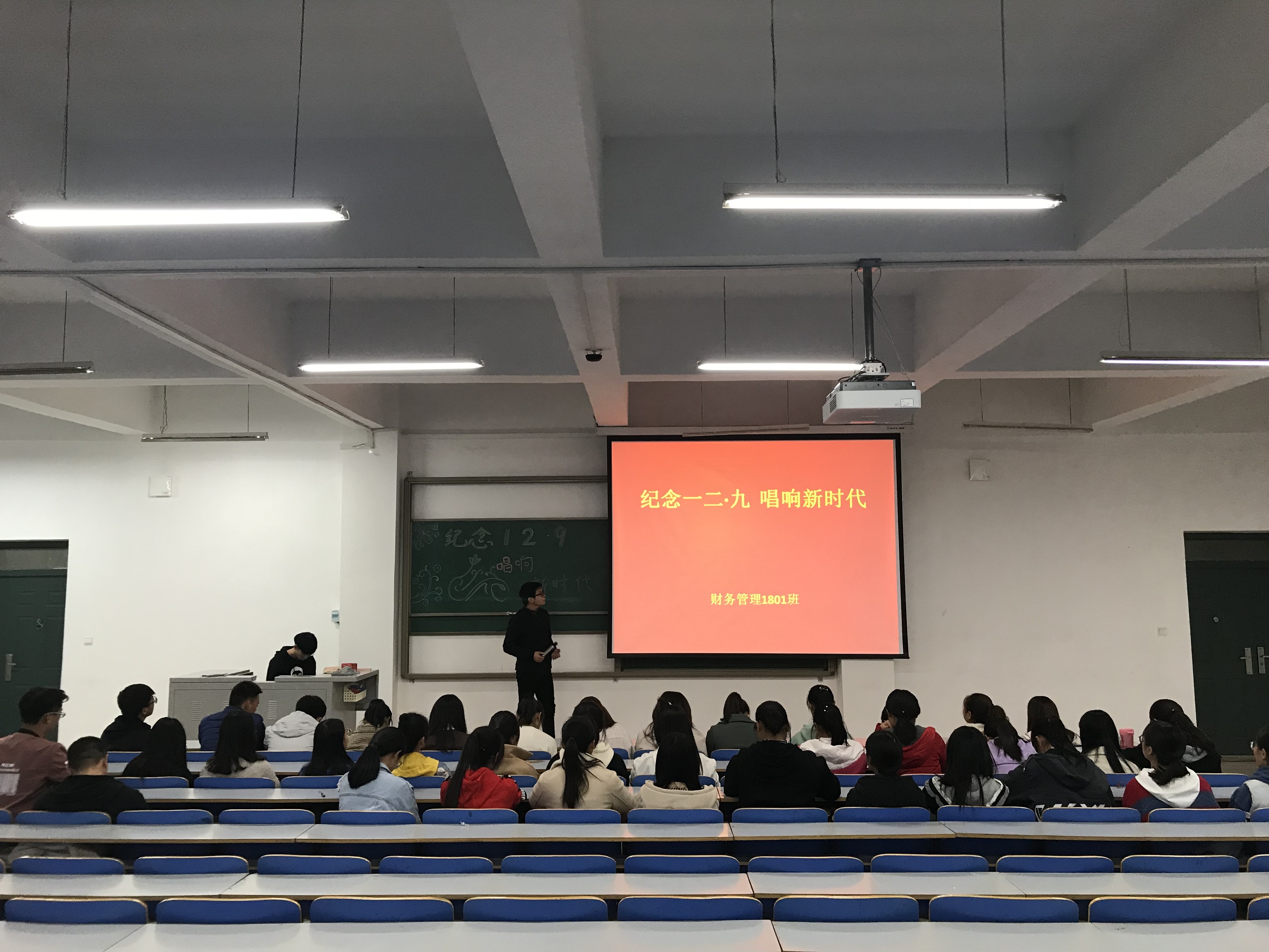 为纪念一二·九运动83周年,深入了解先辈们的崇高理想,激发同学们的爱国热情,坚定理想信念。经济与管理学院于2018年11月23日17点在经管楼309举办了以“纪念一二·九,唱响新时代”为主题的团日活动。财务管理1801班全体学生参加本次活动。