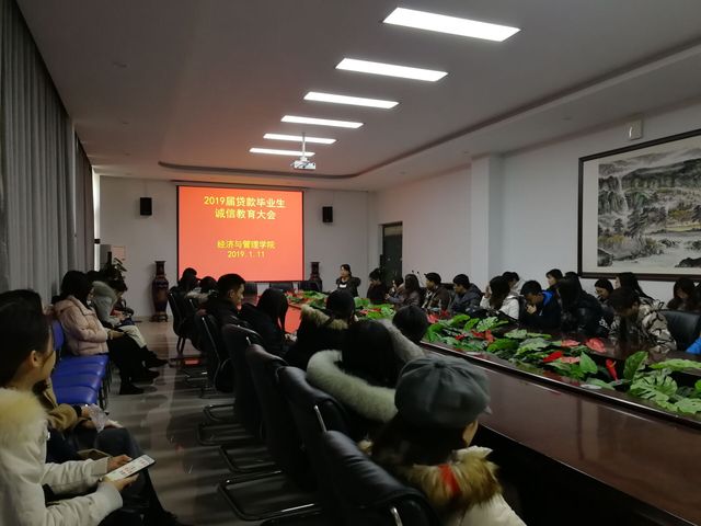 1月11日中午,经济与管理学院在经管楼116召开2019届贷款毕业生诚信教育大会,陈莉洁老师和2019届国家助学贷款毕业生参加了会议。