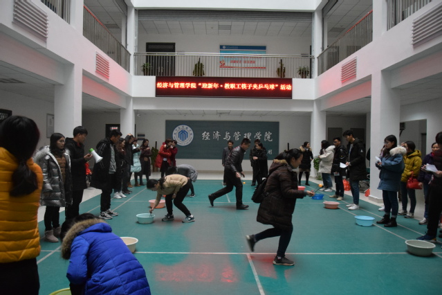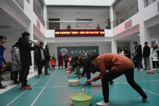 111日下午,为庆祝我校成功更名大学,丰富我院教职工的业余文化生活,迎接新年的到来,经济与管理学院分工会在经管楼大厅举办了“迎新年·教职工筷子夹乒乓球”活动。