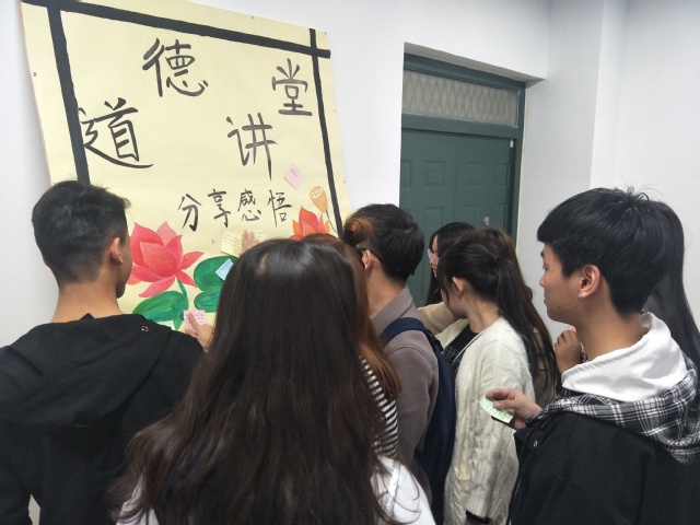 本次道德讲堂活动共有6个环节,分别是“诵一部经典”,“看一段短片”,“讲一个故事”,“唱一首歌曲”,“开展一次互动”,“分享一份感悟”。第一个环节“诵一部经典”,工商管理1802班陈恩杰同学和会计学1801班吕晨同学为我们带来诗歌朗诵《我用残损的手掌》,现场观众无不沉浸于这首诗歌强烈的感染力和号召力之中。第二个环节“看一段短片”,主持人带领大家观看了《感动中国》2018年度人物程开甲先进事迹的视频,视频中程开甲为国家发展、民族振兴所做出的贡献和牺牲深深触动着在场每一位同学的心。第三个环节“讲一个故事”,经济学1701班张晓怡同学讲述了她志愿奉献的故事,从她的故事中,大家明白了每个人都可以用力所能及的一件件小事实现自己的价值。第四个环节“唱一首歌曲”,市场营销1801班赵乐冉同学和财务管理1801班杨云同学带领大家一起演唱了歌曲《我和我的祖国》,悠扬的歌声中传递出了浓浓的爱国之情。第五个环节“开展一场互动”,同学们都积极参与互动,踊跃发言,纷纷表示定会以程开甲前辈为榜样,于细微处体现爱国之情。最后一个环节“分享一份感悟”,同学们都在便利贴上写下自己的感悟与想法,并贴在宣传板上与同学们分享。