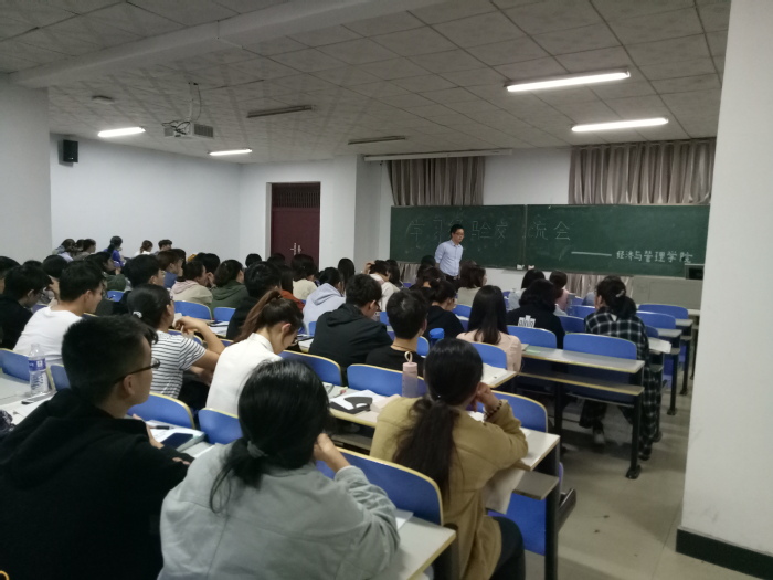 为激发同学们的学习动力,提高经济与管理学院学生的考研热情,丰富同学们生产实习期间的课余生活,2019年4月23日晚7:30,经济与管理学院在禹州实习实训基地1号实训楼B403室成功举办考研学习经验交流会。会计学1601班、1602班全体同学参加了此次活动,活动由带队辅导员刘海廷主持。