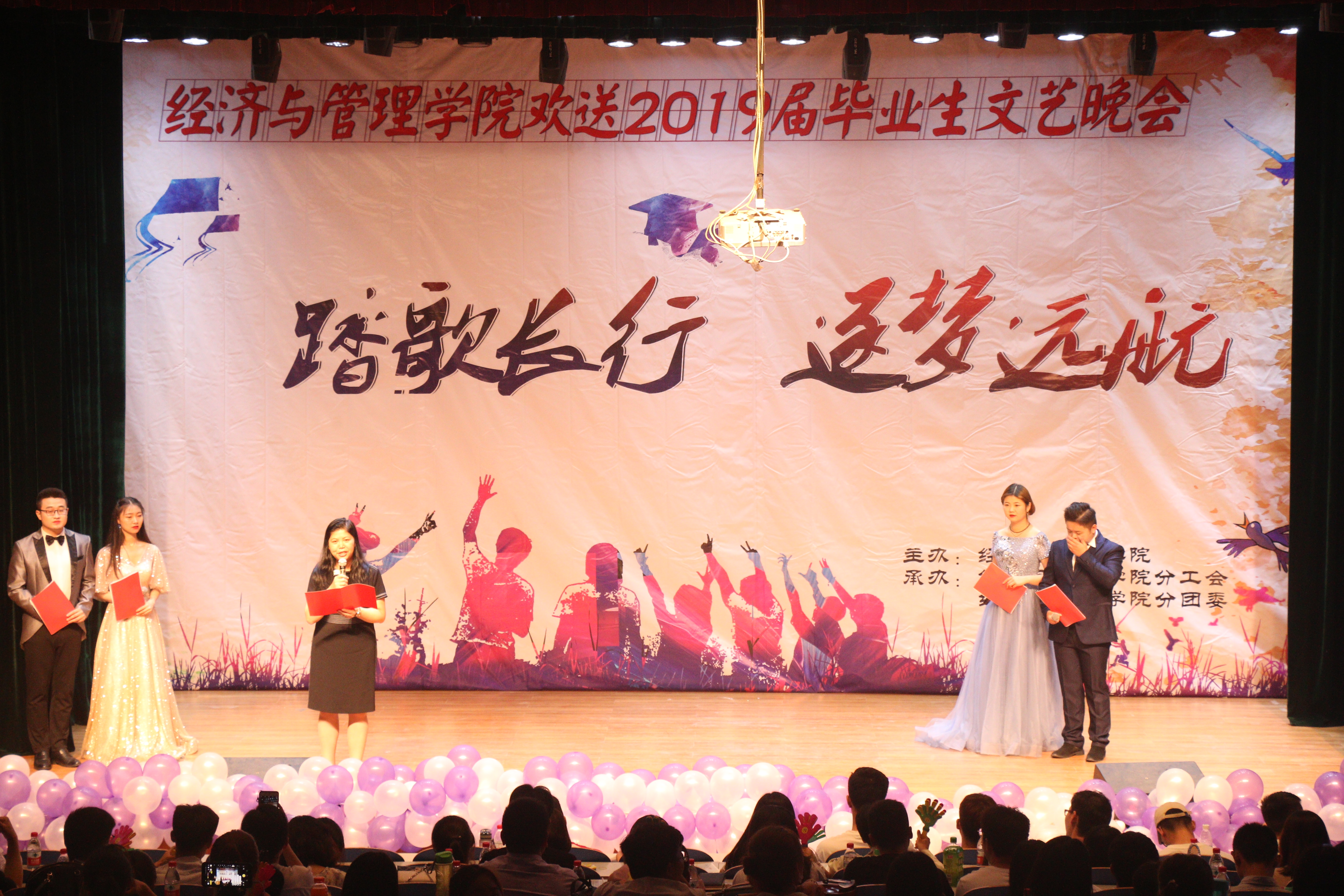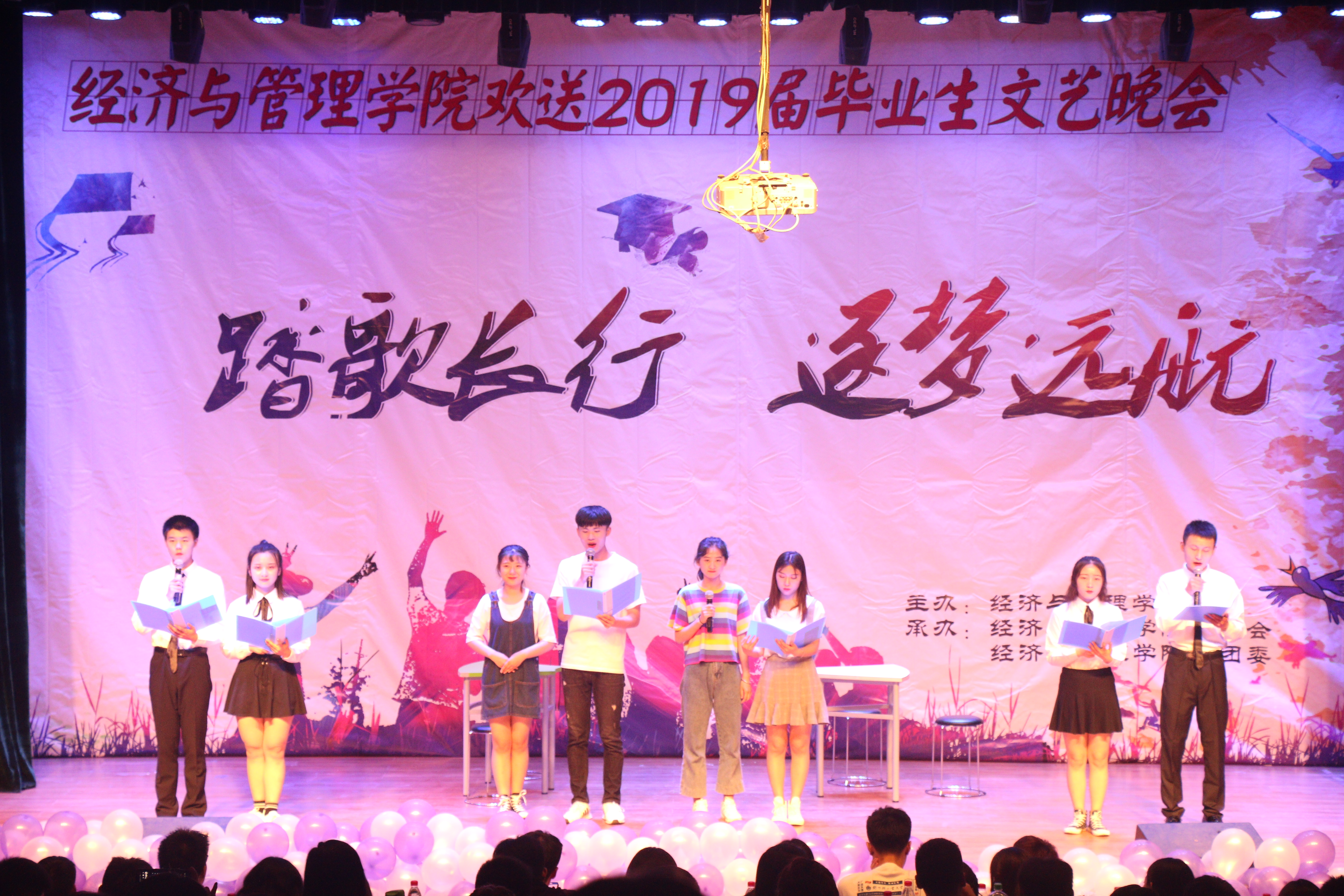 6月6日晚19:00,经济与管理学院在科学校区三教楼208举办了经济与管理学院“踏歌长行 筑梦远航”欢送2019届毕业生文艺晚会。经济与管理学院党总支书记张云超、院长刘珂、党总支副书记陈章美、教师代表、全体专兼职辅导员及2019届全体毕业生们共500余人前来观看演出。