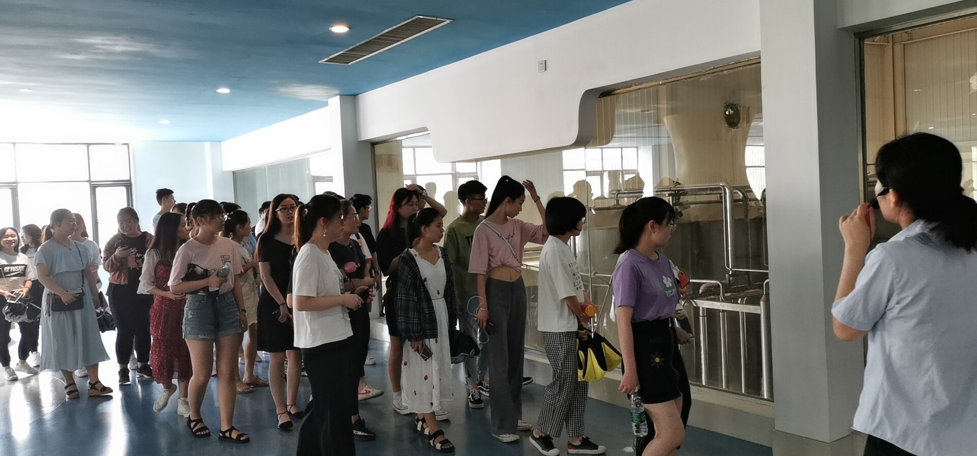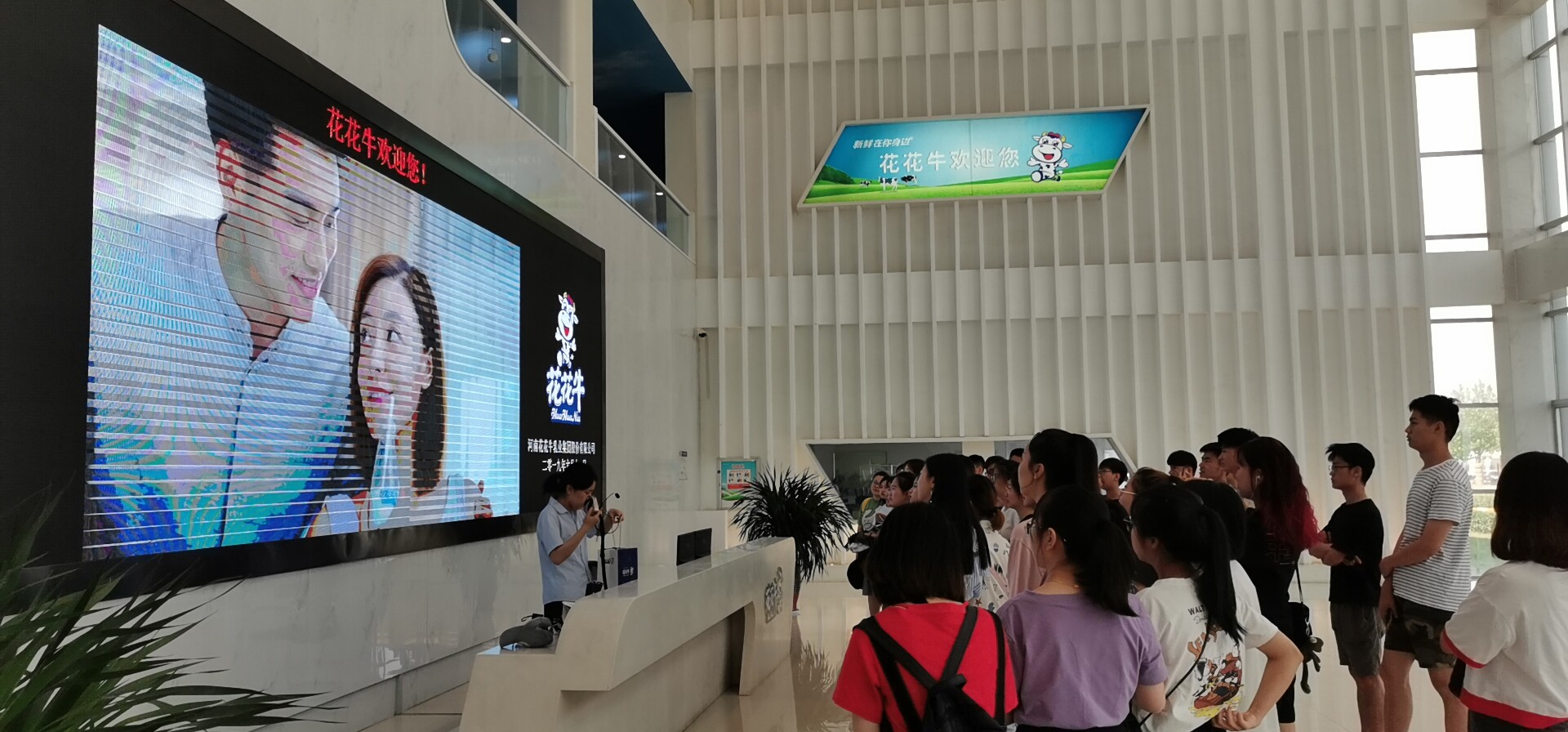 花花牛公司的相关工作人员热情接待了工商管理系的师生。首先是介绍了花花牛公司的经营理念和生产模式,公司的企业文化是“不忘初心,坚守匠心,不断创新,积极承担社会责任”,学生随后参观学习了公司的产品展厅。其次,公司相关人员带领师生参观了包装罐车间、发酵罐车间、电脑操作车间、生产车间以及制冷车间。参观过程中,学生们了解了酸奶的历史、酸奶的分类和菌种的分类,也了解了酸奶的文化习俗,并深入学习了企业的“公司+基地+农户”的产业模式。同时,学生们也近距离接触了企业的先进设备,认知了贮奶缸、混合缸、高压均质机、装箱机等,开阔了视野。