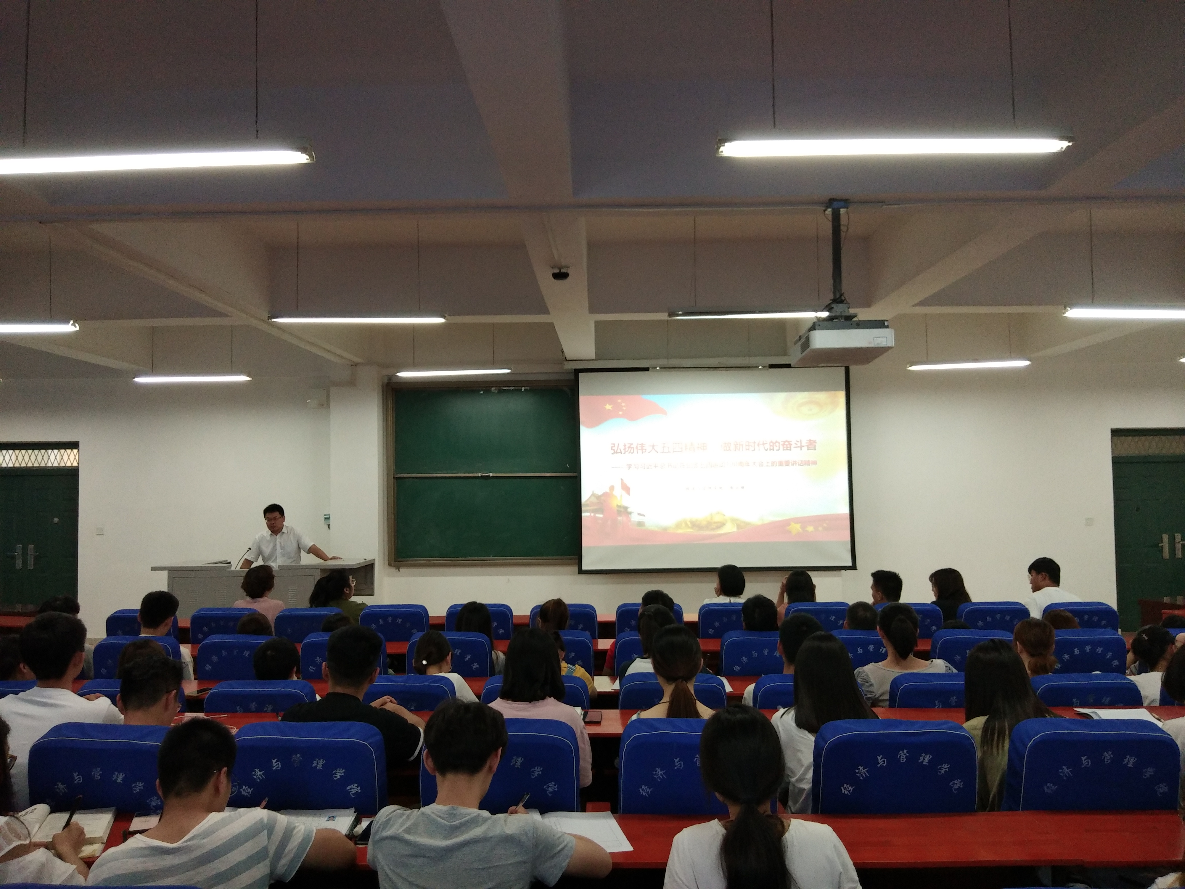 张书记首先带领大家一起回顾了五四运动的历史,简要介绍了五四运动的背景、经过、结果、性质等情况;然后从“高度评价五四运动历史意义”“六点要求深情寄语当代青年”“用极大力量做好青年工作”“自古英雄出少年”“党旗所指就是团期所向”等五个方面重点解读了习近平总书记重要讲话的主要内容;最后,他结合习近平总书记重要讲话要求,就青年大学生如何传承五四精神、建功新时代提出了六点要求:一要以远大理想确立人生航向,二要在爱国主义旗帜下奋勇前行,三要以责任与担当写下青春诗行,四要在砥砺奋斗中书写新奇迹,五要在练就过硬本领中勇担时代重任,六要修身立德走好人生路。