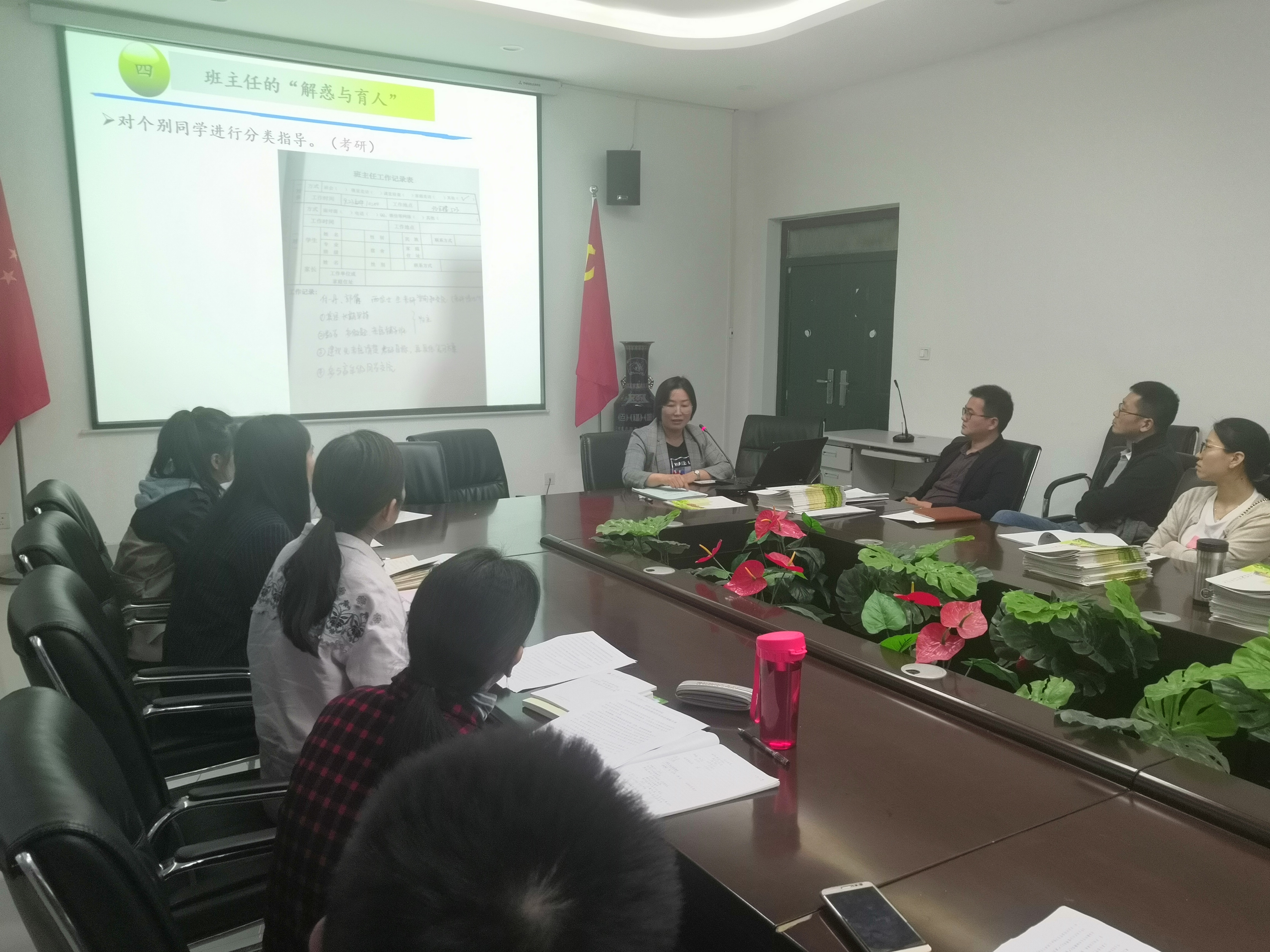 我院工商管理2018级2班班主任徐明霞博士结合自己担任班主任工作一年来的亲身经历,分别从“标杆作用”、“爱心与关注”、“学业引导”、“解惑与育人”四个方面跟大家交流分享了工作经验和心得体会。徐博士认为,作为班主任,一定要心里永远装着学生,给学生多一些爱心和关注,加强对学生的正确引导和指导,时时育人,事事育人。
