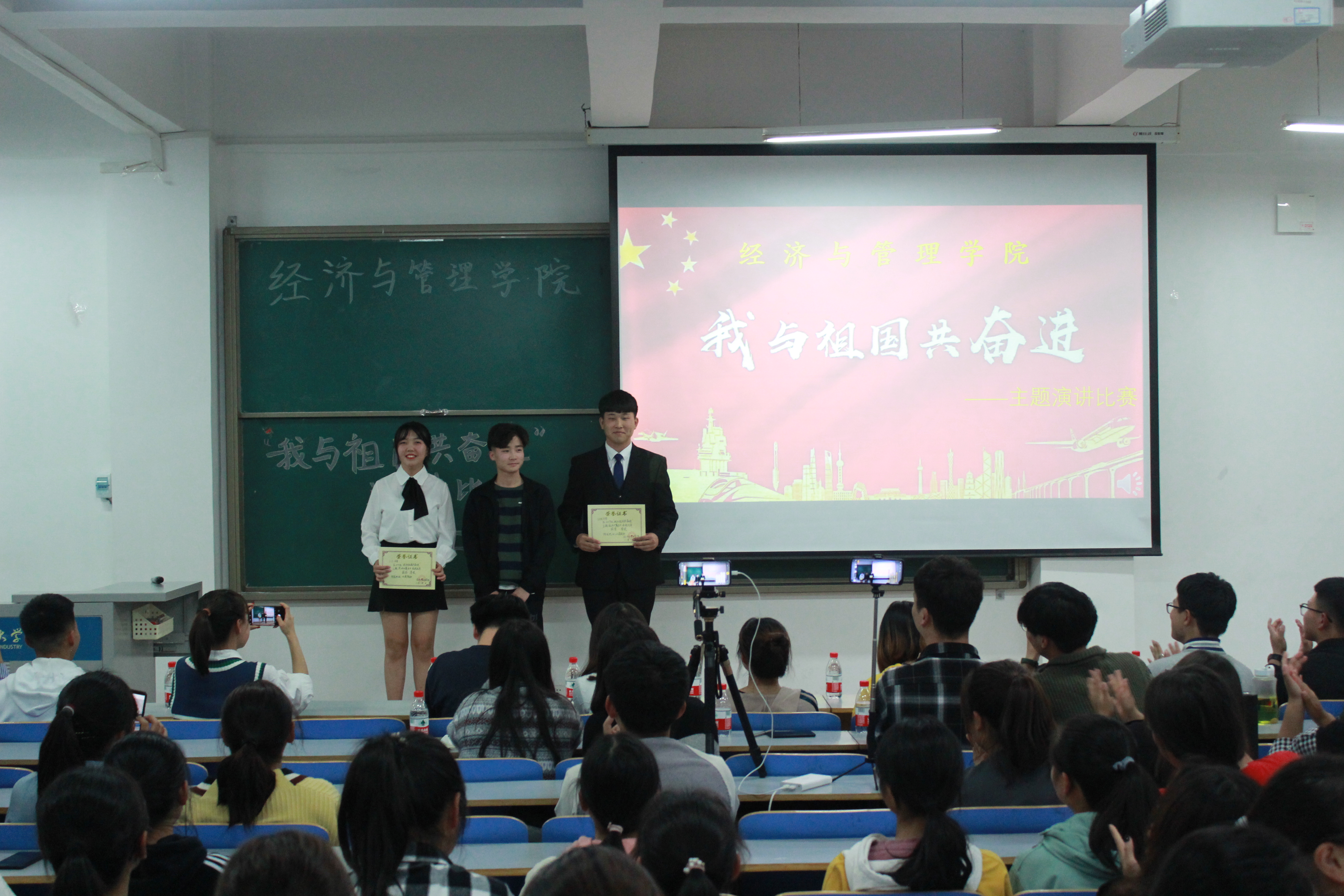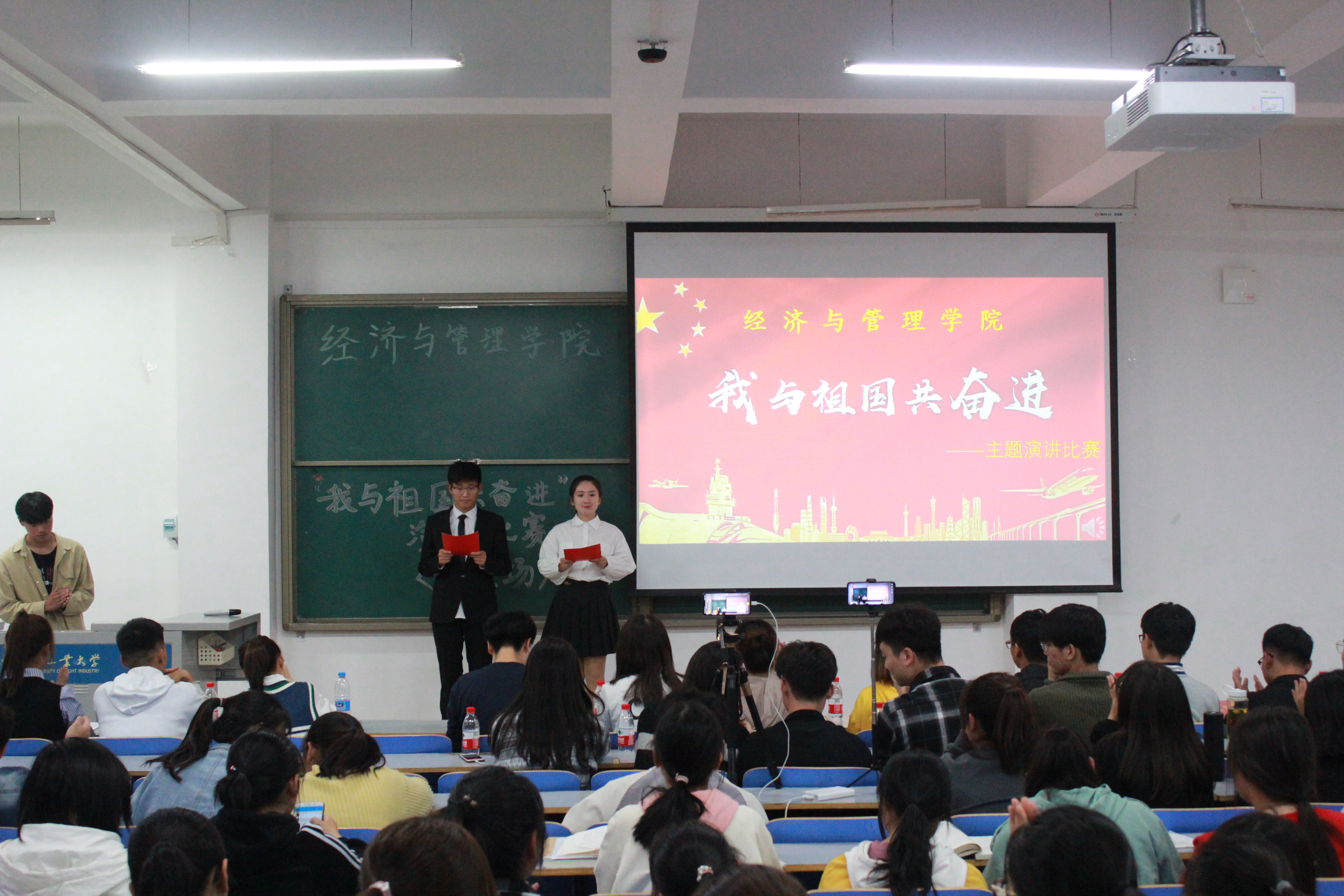 为庆祝祖国七十华诞,激发同学们的爱国情怀并且丰富同学们的课余生活,更好发掘同学们的口才能力,经济与管理学院特于10月31日和11月1日晚上19:30,在经管楼309举办“我与祖国共奋进”主题演讲活动,经济与管理学院学生会主席团、演讲与口才协会会长、学院学生会干部担任比赛评委,19级同学参加了本次活动。