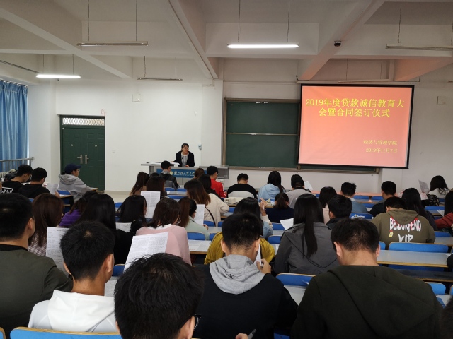 为保证我院助学贷款工作顺利进行,同时教育广大学生诚信做人,经济与管理学院于2019年11月7日在经管楼309召开2019年度国家助学贷款合同签订暨诚信教育大会,负责资助的老师陈莉洁及全体贷款学生参加了此次会议。
