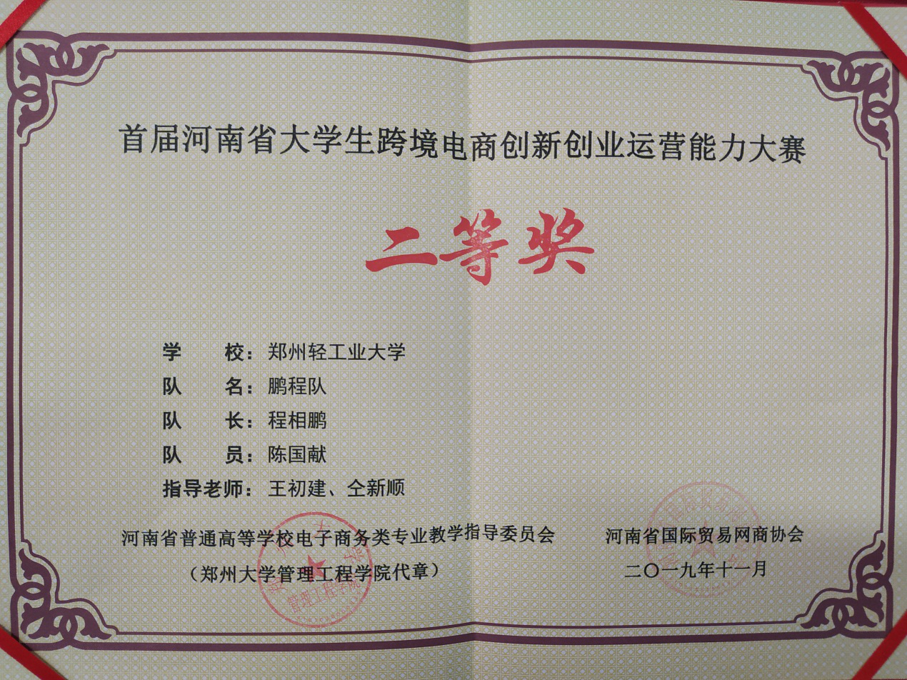 首届河南大学生跨境电商创新创业运营能力大赛于20191130-121日在郑州大学管理工程学院隆重举行。本次比赛由河南省商务厅指导,河南省国际贸易网商协会主办,郑州大学管理工程学院承办,我校在校园选拔赛基础上选派经济与管理学院电子商务专业程相鹏、陈国献2名选手参加了本次大赛。
