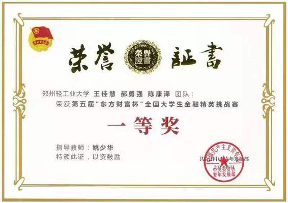 近日,由共青团中央青年发展部主办,东方财富信息股份有限公司、全国学校共青团研究中心承办的2019年第五届“东方财富杯”全国大学生金融精英挑战赛圆满落下帷幕。经过激烈角逐,我校1支团队获得全国大学生金融精英挑战赛一等奖,2支团队获得二等奖,9支团队获得三等奖,我校姚少华、崔亚娟、陈章美三位老师荣获“优秀指导教师奖”。