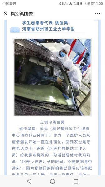 市场营销2019级本科学生姚佳昊,来自上海市金山区枫泾镇。寒假返回家乡,面对疫情的突然降临,毅然决然报名参加了镇团委组织的疫情防控志愿者。在上海与浙江交界的检查站,积极帮助医务人员对来沪人员进行信息登记和体温测量,对不符合条件的外来人员以及A类人员进行劝返和安置。他说,父母都是医务人员,每天奔波于疫情防控一线,看到父母忙碌的身影,作为一名大学生,应该担负起一份社会责任,积极为疫情防控做贡献。