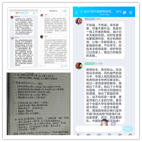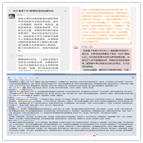 此次的线上思政课,艾四林、秦宣、王炳林、冯秀军4位教授围绕“在抗击疫情斗争中深化理论认识”、“疫情大考告诉我们什么”、“总结历史经验 增强必胜信心”、“战役里的最美青春——谈中国青年的责任与担当”4个方面主题,为我们深刻解读了党中央关于疫情防控的决策部署,分析了中国抗疫彰显的中国共产党领导和中国特色社会主义制度的显著优势。他们将疫情防控工作中涌现的案例转化为鲜活的课堂,让广大青年上了一堂贴近心灵,直击灵魂,入脑入心的疫情防控“金课”。线上观摩学习结束后,我院师生通过各种在线云班会、在线讨论、自制微信推文等各种方式热议“思政大课”,并展开热烈讨论,撰写心得,将自己的所感所悟和同学们分享!辅导员们还和学生们就此次思政课围绕这次疫情大考对我们的启示、对于中国青年的责任与担当等方面开展了热烈讨论。