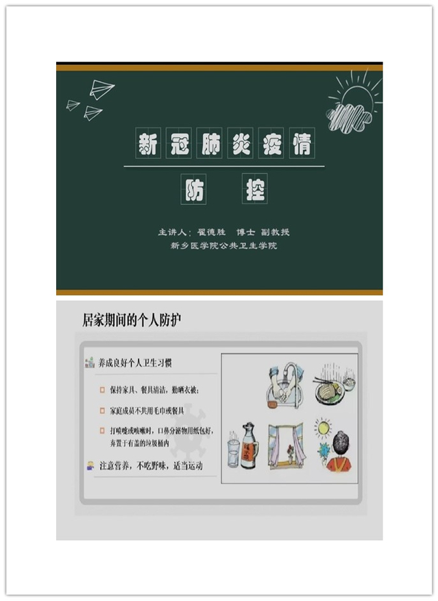 本次疫情防控知识由各辅导员、班主任根据班级实际情况组织各班学生认真集体线上学习或者线下分散学习,并要求同学们要学有所获、学有所得。翟德胜教授的《新冠肺炎疫情防控知识课程》从新型冠状病毒肺炎、居家个人防护、返校途中个人防护和返校后个人防护及疫情防控四个方面讲解,让同学们对疫情防护防控知识有了更进一步的了解,并对大家的日常生活和未来的开学生活有了科学性指导。《春天花会开》展示了平日的郑州被这场突然其来的疫情强制按下暂停键,而这场没有硝烟的战争中,每一个平凡的你我都成为重要的一员,大家在党的坚强领导下坚信,只要我们在一起,春天花会开,明天会更美好!同学们结合疫情防控知识开展了形式多样的特色线上“新冠防控,轻青在行动”系列主题班会,并对新冠防控知识进行交流,班会中同学们采用线上直播、学习笔记交流、疫情防控知识大比拼、心情加油站等活动表达了同学们对战胜疫情的信念以及早日走入校园的期待之情。