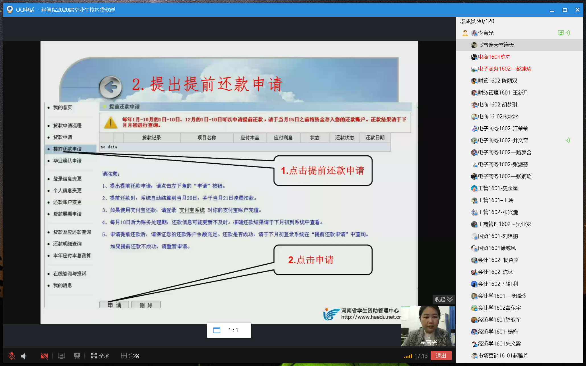 为帮助贷款毕业生了解掌握还款流程和注意事项,加强贷款毕业生诚信教育,5月7日,经济与管理学院通过QQ群课堂召开2020届贷款毕业生线上诚信教育大会。
