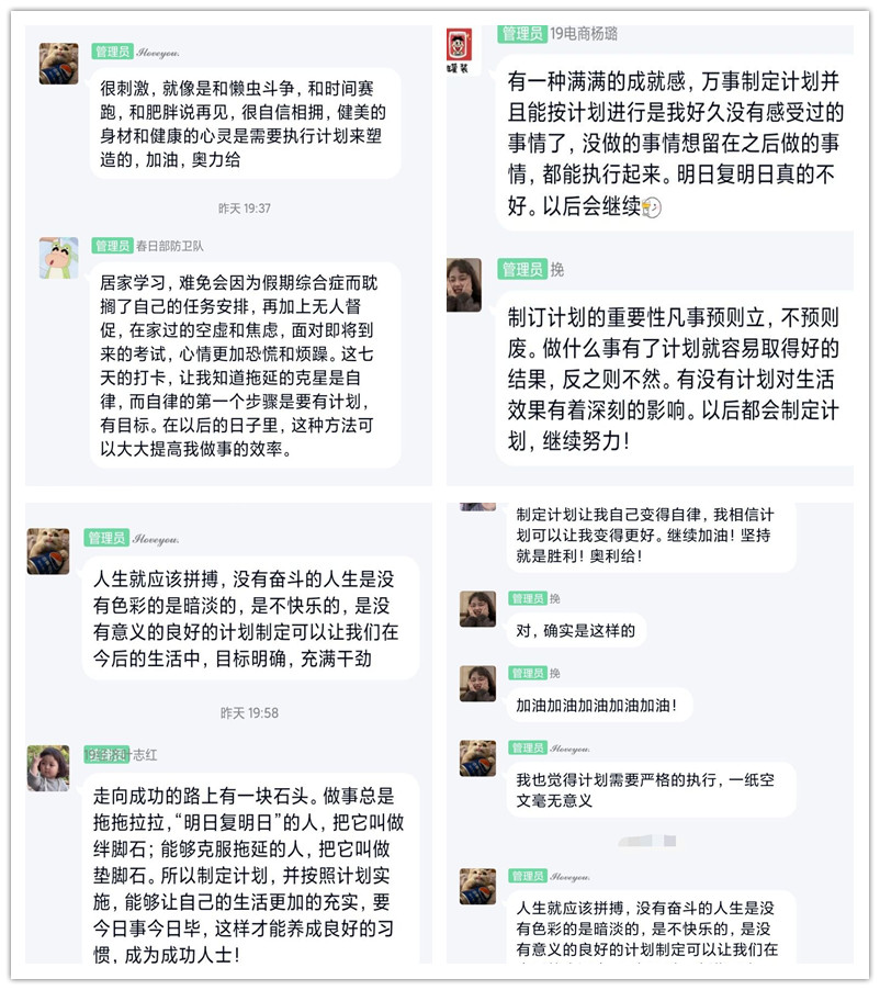 此次活动分为三个部分,首先要求参与同学制作自己的七天计划表,计划表形式不限,然后同学们根据自己的计划表进行连续七天的打卡活动。同学们在制作自己计划表的过程,正式自己目前所面临的拖延问题,并根据自己的特点做好自我监督。七天自律打卡充分锻炼了学生的动手能力和思维能力,同时也缓解了自身拖延带来的学业和生活压力。其次同学们根据七天打卡,体会到自律的好处,有效提高同学们居家学习的自律性,同时也让同学们找到了居家学习正确的作息习惯。最后,同学们根据这七天打卡分享自己的感悟。同学们纷纷表示,这七天的打卡,让自己感受到在学校的充实与满足,减少了居家学习无计划的空虚和焦虑本次活动充分响应疫情居家期间的心理健康活动要求,以“逆境携行,你我同心”为主题,在同学积极参与中取得圆满成功。