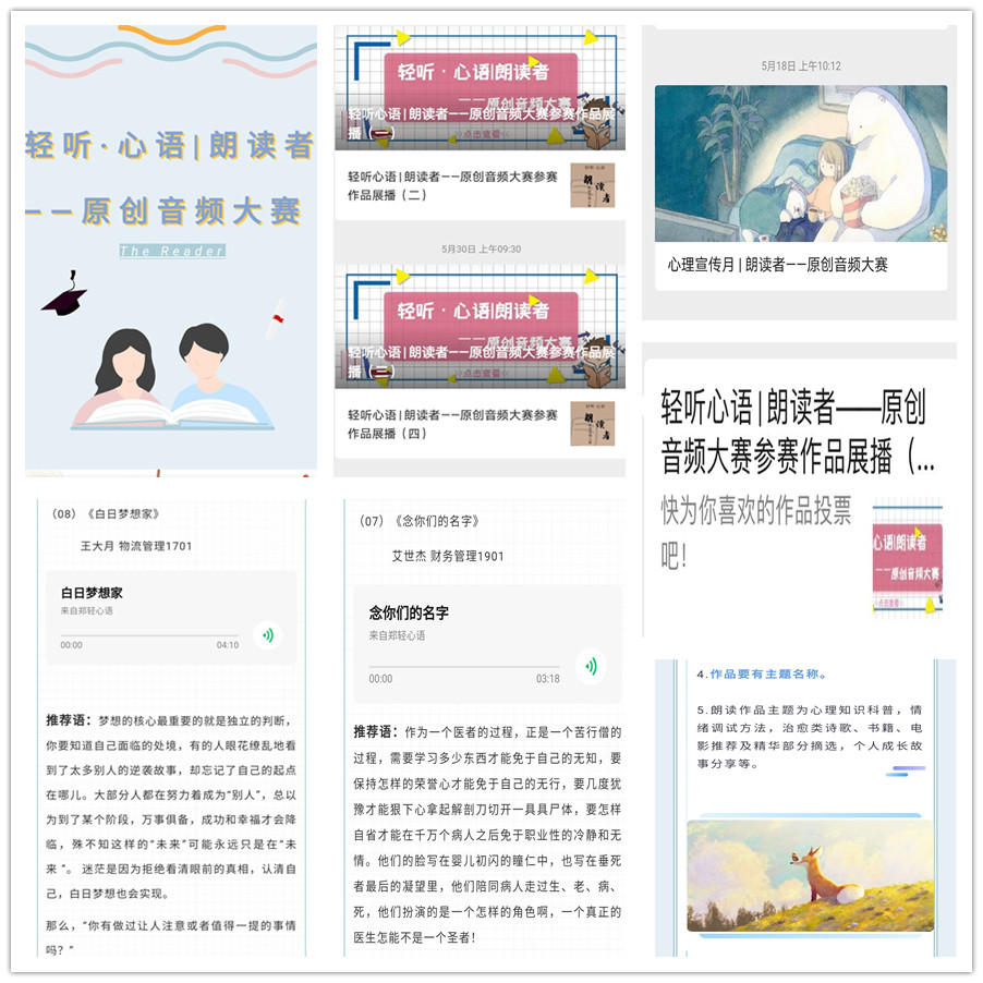 为鼓励同学们挖掘书香与文字的力量和美,用最动听、纯净、治愈的声音,描绘书香美景,传递情绪情感,安抚与陪伴心灵,从而培育积极向上、阳光乐观的健康心态,我院举办“轻听·心语——朗读者”蒲公英心理素质提升项目活动。本次活动以“疫”心相助,携手成长为主题面向我院全体在校生展开。