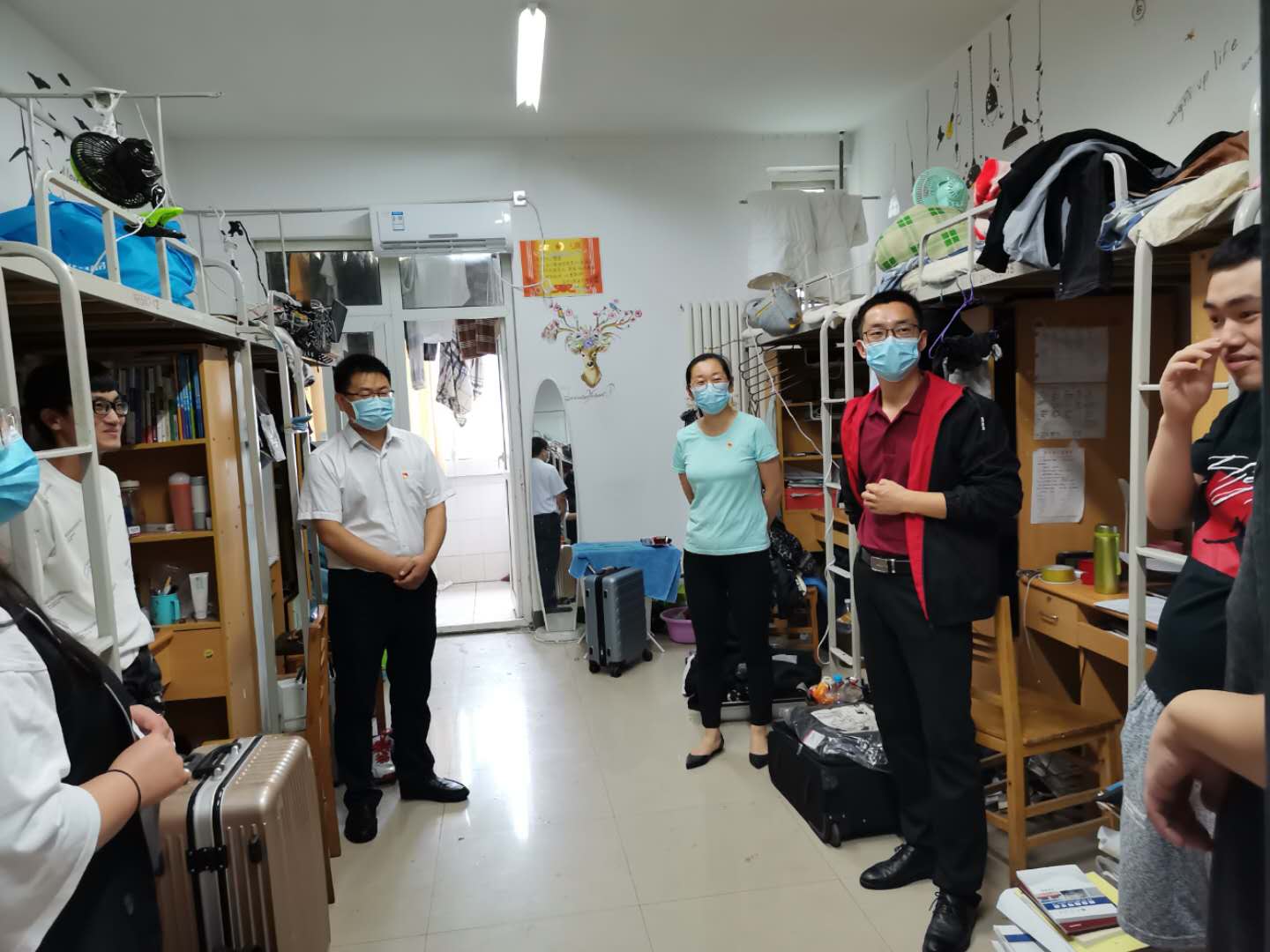 走访过程中,老师们走进每一个宿舍,与毕业生们进行了亲切交谈,详细了解毕业生的健康情况、疫情期间的适应情况、就业去向、生活近况、离校准备情况以及在离校过程中存在的问题和困难;鼓励同学们在新的工作岗位要主动学习、踏实工作、积极思考、勇于创新,要心系母校,以实际行动为母校争光添彩;当前仍是疫情防控关键时期,希望同学们珍惜难得在校时光,严格遵守疫情防控期间学校各项规章制度,配合做好疫情排查、信息填报等工作,不断增强安全防范和自我保护意识,真正做到文明离校、安全离校、温暖离校。疫情导致2020届毕业生是不平凡的一届毕业生,老师们也纷纷叮嘱学生要认识到今年就业的严峻形势,抓住有利时机,争取早日就业。毕业生也纷纷表达了对老师和同窗的不舍之情以及对母校培养的感激之情,表示将一定努力工作,不辜负校的培养老师的期望,并将始终关注和支持校的发展,祝愿母校的明天更加美好。