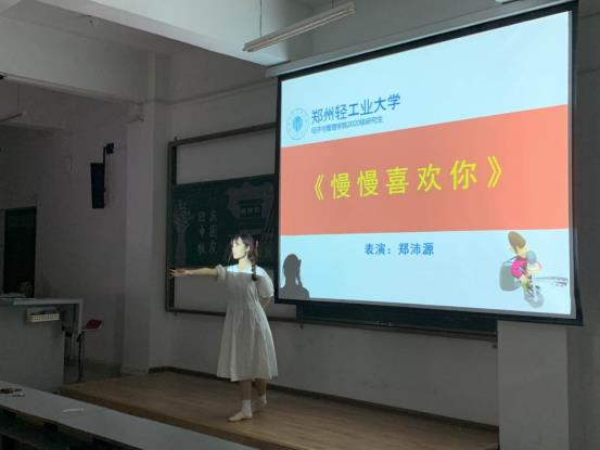 一首韩中豪同学带来的《消愁》为本次庆国庆,迎中秋晚会拉开了序幕李慧敏同学演唱了陈粒的《走马》,一开口就仿佛让我们听到了原唱的现场,引得观众发出了热情的掌声第一次表演脱口秀的郑世豪同学用幽默的语言为同学们展现了自己的一场脱口秀首秀,以自身的生活经历为基础进行表演,为观众带来了很大的快乐MPACC班同学的白雪公主话剧表演让现场的观众开怀大笑,他们以别样的方式为我们展现了不同的白雪公主的故事。之后伴随着《慢慢喜欢你》的音乐,郑沛源同学在讲台上翩翩起舞,那一刻她就如小公主一般,在对心上人用舞蹈诉说着自己的爱意,观众也都打开自己的手电筒为她应援,整个教室充满着温暖作为王力宏的铁粉徐智帅同学,在这次活动中演唱了王力宏的经典歌曲《大城小爱》,获得了观众们的一致好评最后王雪妮和海盼盼同学给我们带了一曲《我还年轻,我还年轻》,赢得了同学们的阵阵掌声。