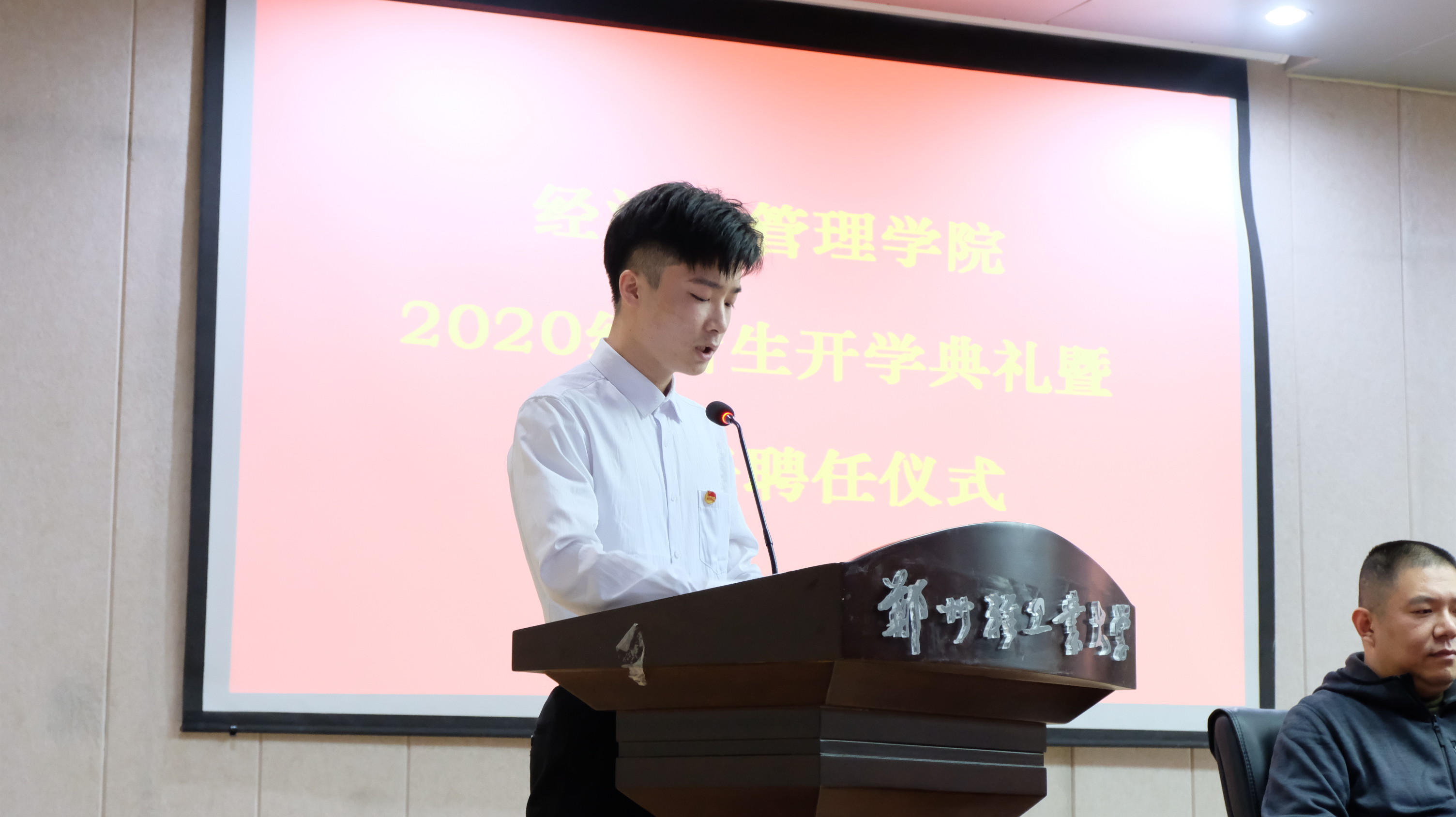 学院学生会主席杨树波同学作为老生代表发言,与广大新生分享了自己学习成长的经历和体会,倡议新同学秉承“为之则易 不为则难”的校训精神,塑造厚德、笃行、经世、致用的品格,坚定理想信念,矢志拼搏奋斗;求真知敢实践,博学笃行奋勉;勇担时代使命,引领时代奋进,在担当中历练,在尽责中成长,努力创造属于自己的精彩未来。