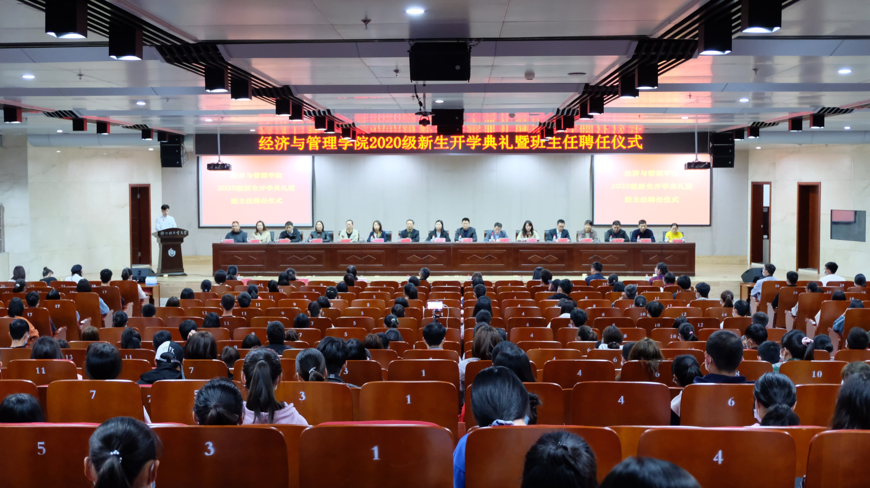 10月7日下午4:30,经济与管理学院在科学校区图书馆一楼学术报告厅举行2020级新生开学典礼暨班主任聘任仪式。学院领导班子全体成员、各系(科室、中心)负责人、新生辅导员、新生班主任及2020级新生参加了典礼。典礼由学院党委副书记陈章美主持。按照疫情防控要求,典礼采取线下与线上直播相结合的方式进行。