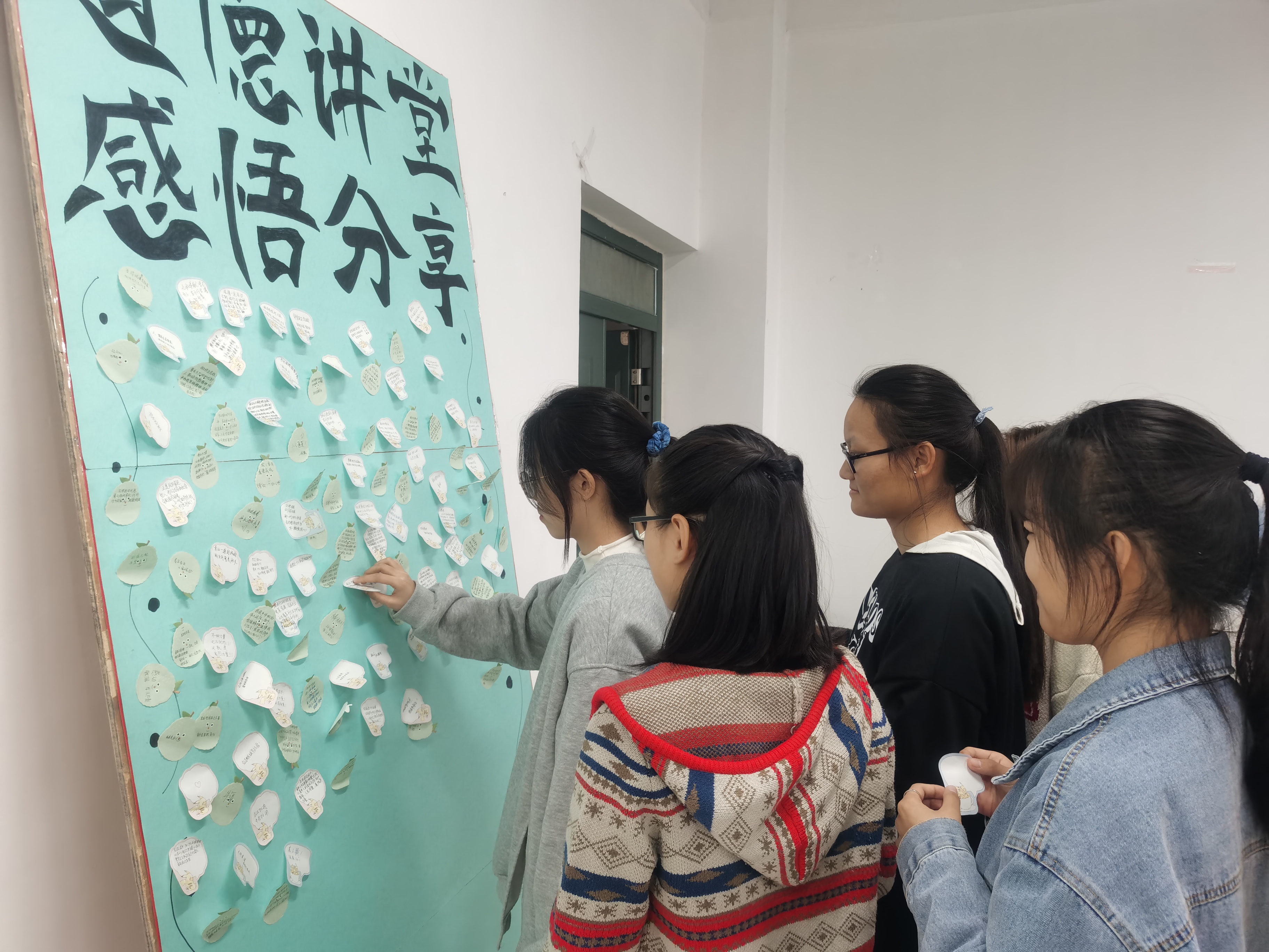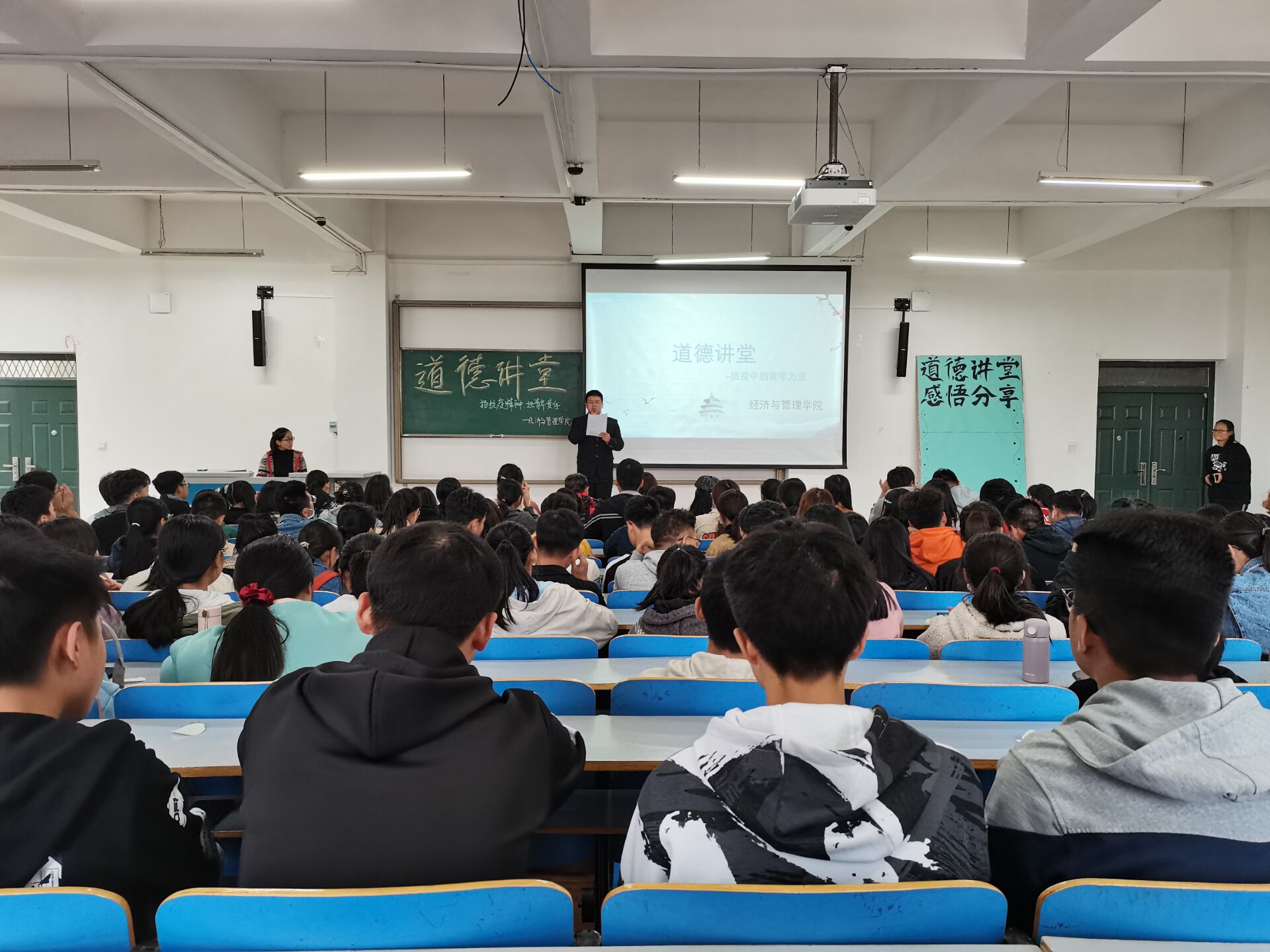 本次道德讲堂活动一共分为五个环节。首先,由学生代表全体起立并奏唱国歌,让浓浓的爱国之情深深传唱,让爱国深入到每位同学的心中。接下来主持人带领大家了解抗疫英雄彭银华的个人事迹,“医生的道德让彭银华身披白甲,为人的道德让他以身为盾,他秉持心中的那份理想信念和一腔热忱,疫情不散,婚礼不办!”让同学们深深感受到了当代青年的无畏困难、勇于担当、无私奉献的时代精神。同学们还认真观看了一段关于奋战在抗疫一线人员的感人故事,并讲述了自己对此次抗击疫情的感想,表达出了对抗疫人员的无比敬佩。最后,同学们把对本次活动的体会与感悟写在便签上并在工作人员带领下贴在展板上,让越来越多的同学们感受青年力量的伟大,激励同学们要以德为邻,担当有为!