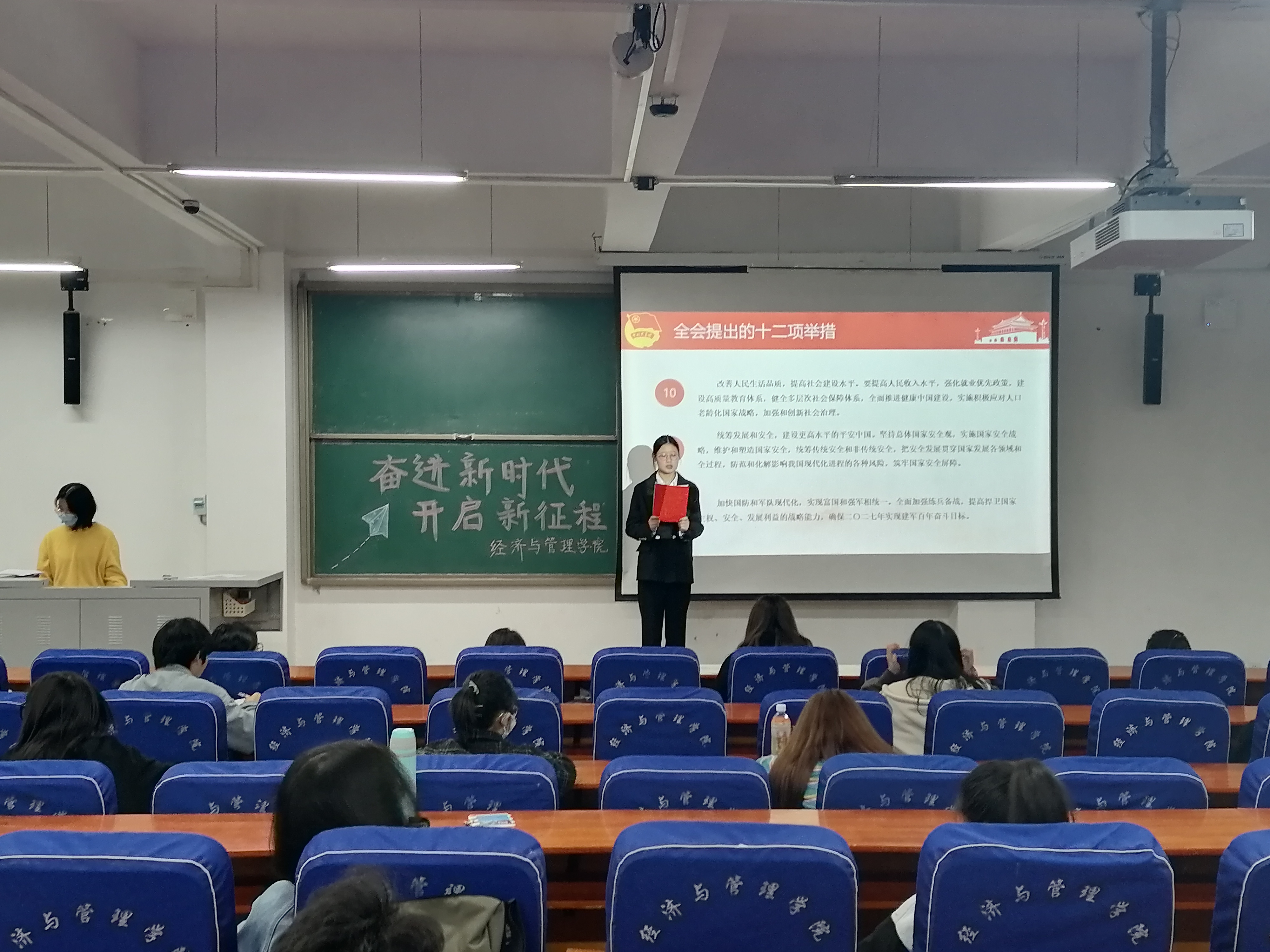 为纪念一二•九爱国运动85周年,激发同学们的爱国情怀,进一步加深同学们对一二•九运动精神以及党的十九届五中全会提出的有关国家发展规划的了解和认识,经济与管理学院于2020年11月19日晚7:30在经管楼211举办纪念一二•九运动85周年系列活动之“奋进新时代,开启新征程”主题团日活动。经济与管理学院2020级学生代表参加本次活动。