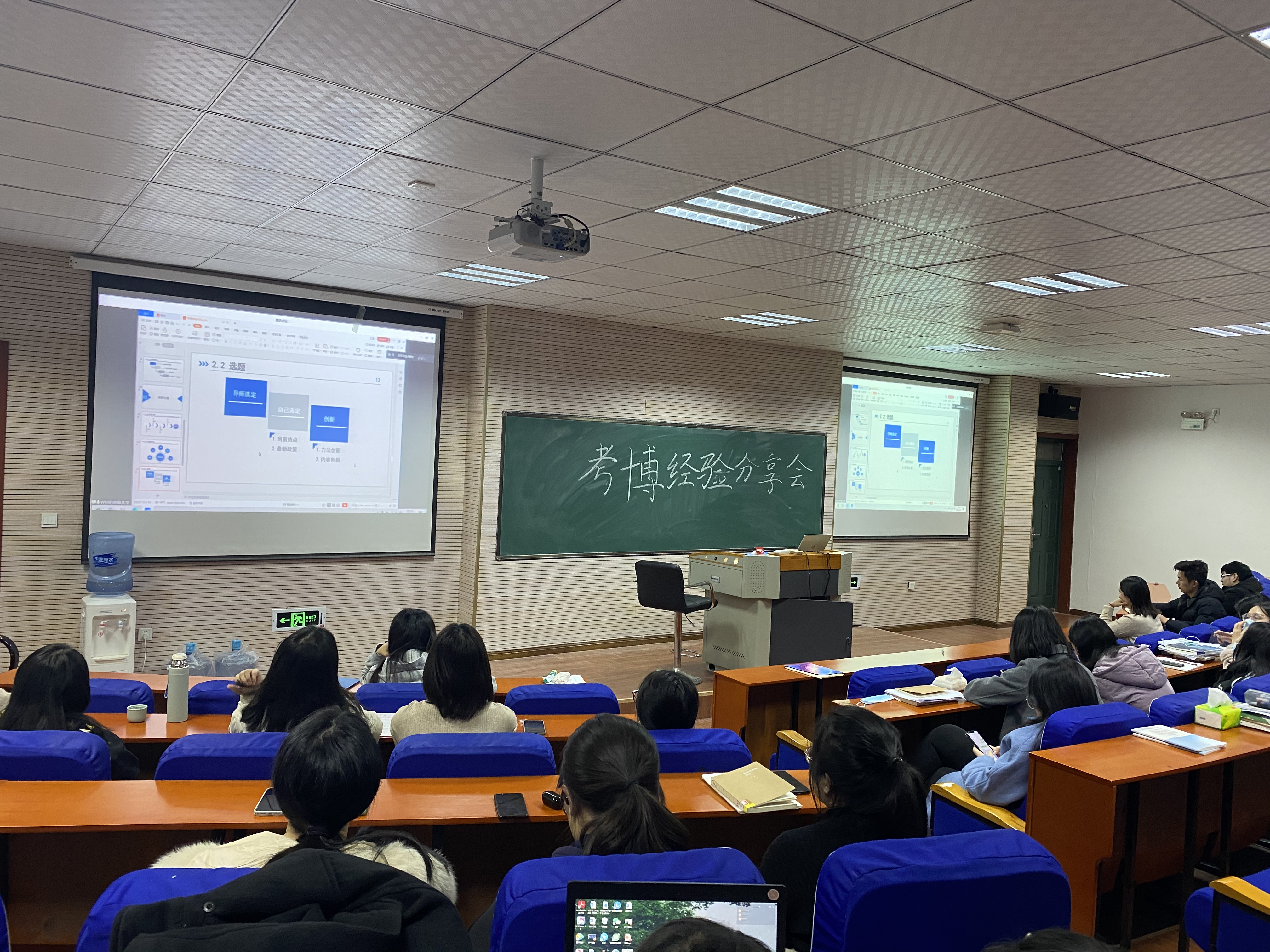 吴明同学首先发言,她从考博自述与科研心得两方面分享自己经验,她讲解了寻找学校、导师、报名考试以及科研论文从确定方向到成果各个细节中可能存在的问题,并针对性地提出了相应的处理方法。例如:在选择学校方面,建议要针对自己的兴趣与研究方向找到与此相关的导师;在论文写作方面,针对论文的各个部分分享了自己的写作方法。随后常江波同学从考博过程回顾、博士生活、科研经验、建议四个方面为大家分享自己的切身经验。在考博过程回顾中,她建议有意向考博的同学应该尽早明确目标,坚定考博心志后再进行院校选择,并开展前期准备工作;除了分享上述考博技巧外,也分享了一些科研经验,例如常用的文献搜索引擎和提高学习效率的工具方法等。互动环节,同学们踊跃提问,两位考取博士研究生的同学耐心解答,并用“为之则易,不为则难”的校训鼓励同学们努力考取博士研究生。