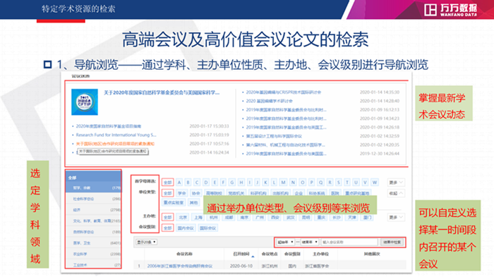 在万方知识服务平台上,我们可以用通过导航浏览和检索浏览的方式来查找优质的会议及高价值会议论文。这是会议的导航页,页面上部实时更新着近期的会议信息,方便大家集中浏览,可以掌握近期各组织和协会举办会议的情况。